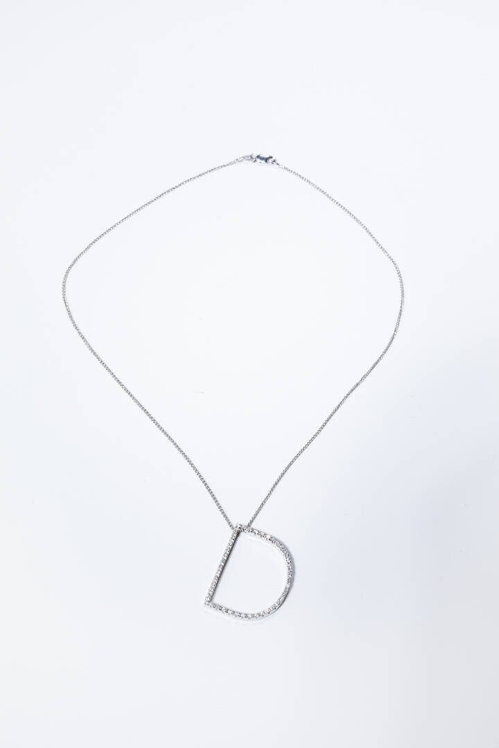 in oro bianco, a forma di lettera "D" in diamanti taglio brillante per totali ct 0,33 ca, probabile colore G-H, purezza IF-VVS.