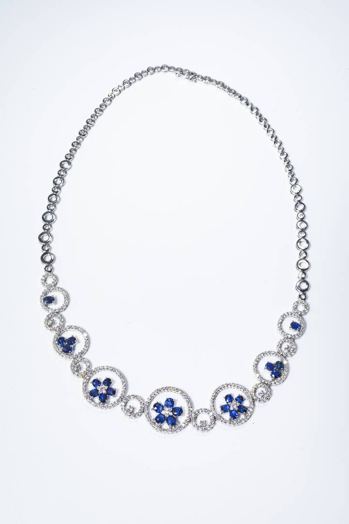 in oro bianco, cerchi degradé, in diamanti taglio brillante per complessivi ct 2,0 ca e zaffiri taglio ovale per complessivi ct 6,0 ca.