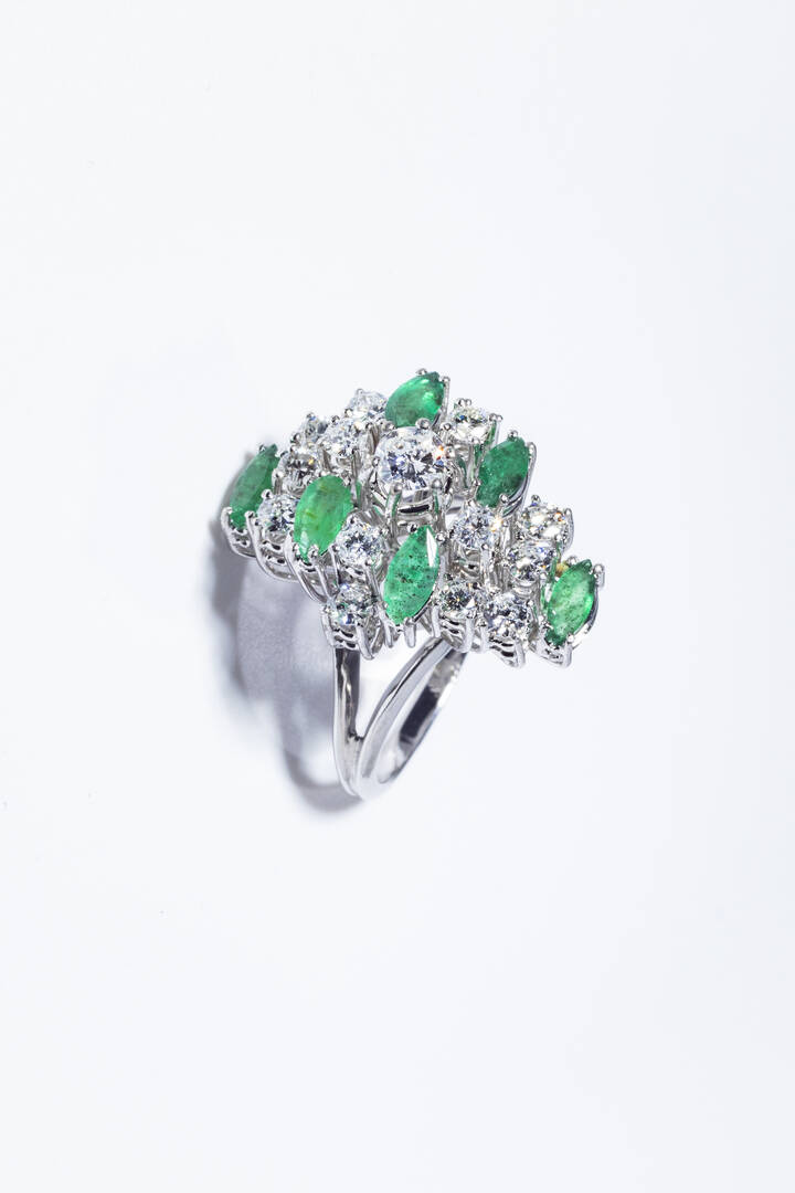 in oro bianco, sommità a cespuglio, con diamanti taglio brillante per totali ct 1,20 ca e smeraldi taglio navette per totali ct 1,0 ca.