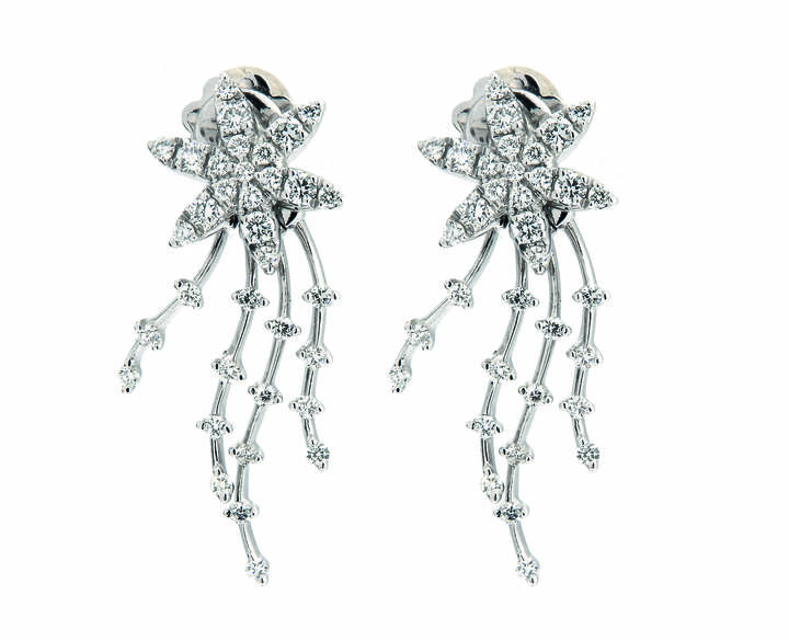 in oro bianco, composti da fiori stilizzati ai lobi e frange pendenti. Diamanti taglio brillante per totali ct 0,87 ca, probabile colore G-H, purezza IF-VVS.