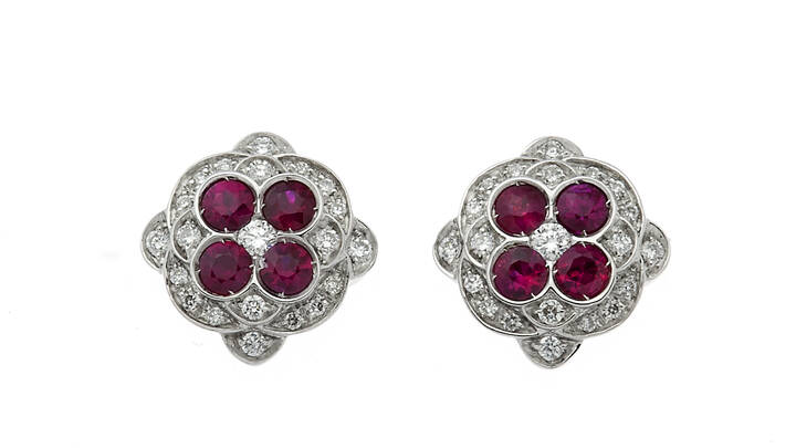 in oro bianco, a lobo, di forma fantasia con otto rubini taglio rotondo per totali ct 0,78 ca e diamanti taglio brillante a decoro.