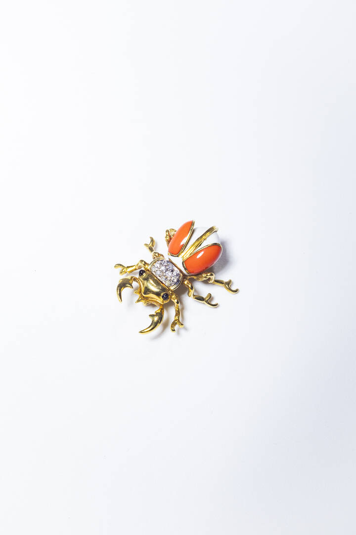 in oro giallo, a forma di coleottero, con smalti policromi e diamanti taglio 8/8 per totali ct 0,10 ca.