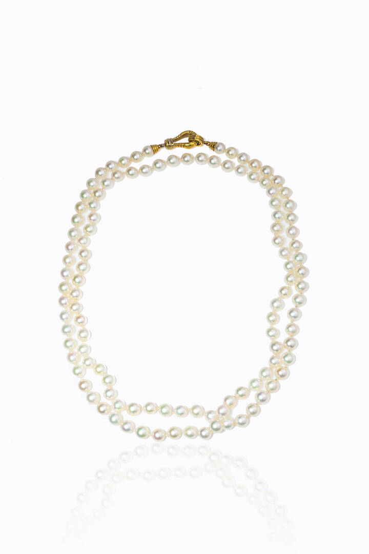 composta da un filo perle giapponesi del diam. di mm 7,5 ca. Chiusura oro giallo a moschettone.