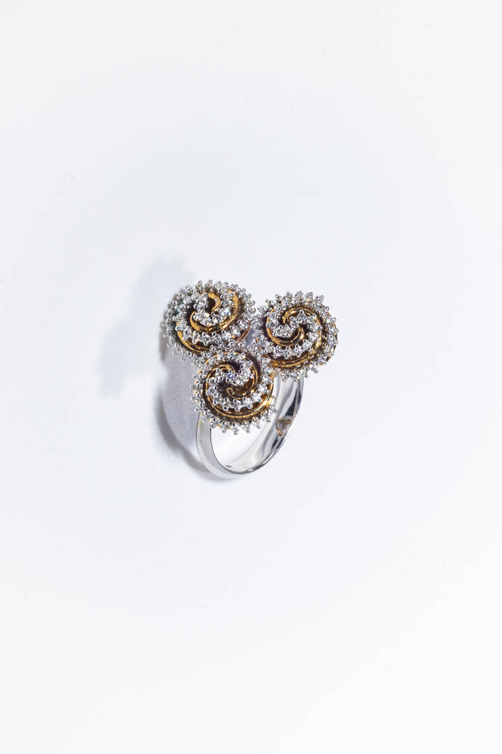 in oro giallo e bianco, sommità composta da tre spirali disposte a triangolo, diamanti taglio brillante per totali ct 0,62 ca, probabile colore G-H, purezza IF-VVS.