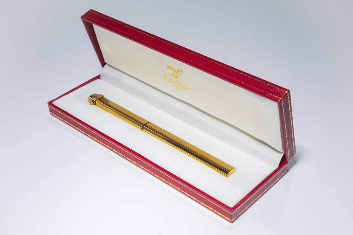 Penna a sfera marcata " Must de Cartier". Corpo e cappuccio laminati oro. Corredata di scatola e libretto
