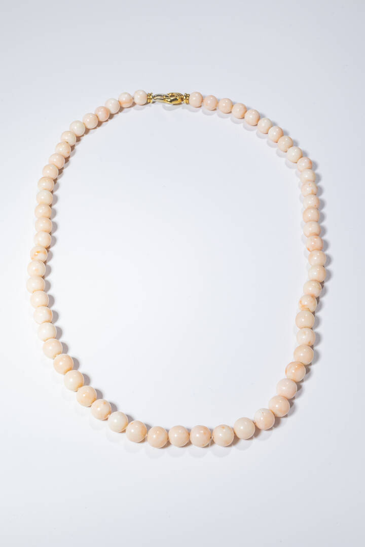 composto da sfere di corallo rosa del diam. di mm 10 ca. Chiusura in oro giallo a moschettone