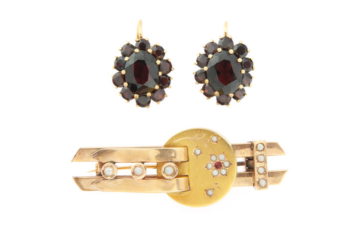 -spilla in oro 9 Kt, XIX secolo, con perline a decoro. Peso gr 9,3