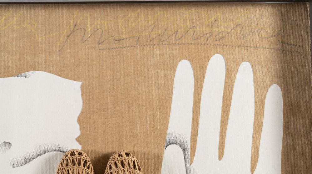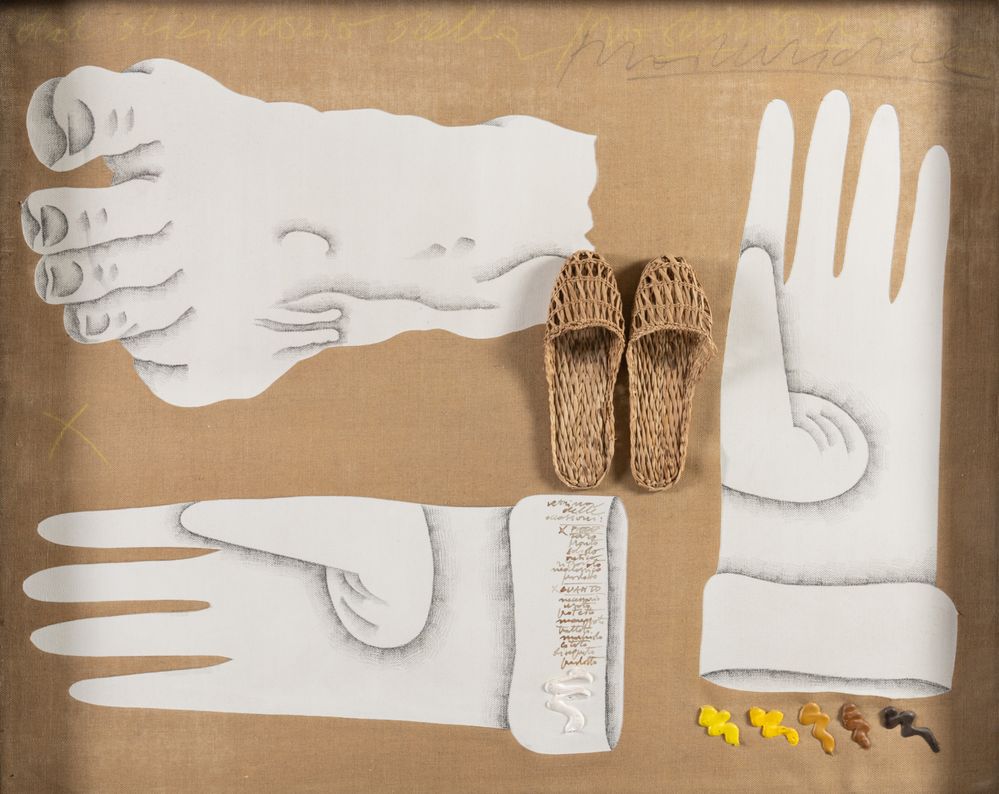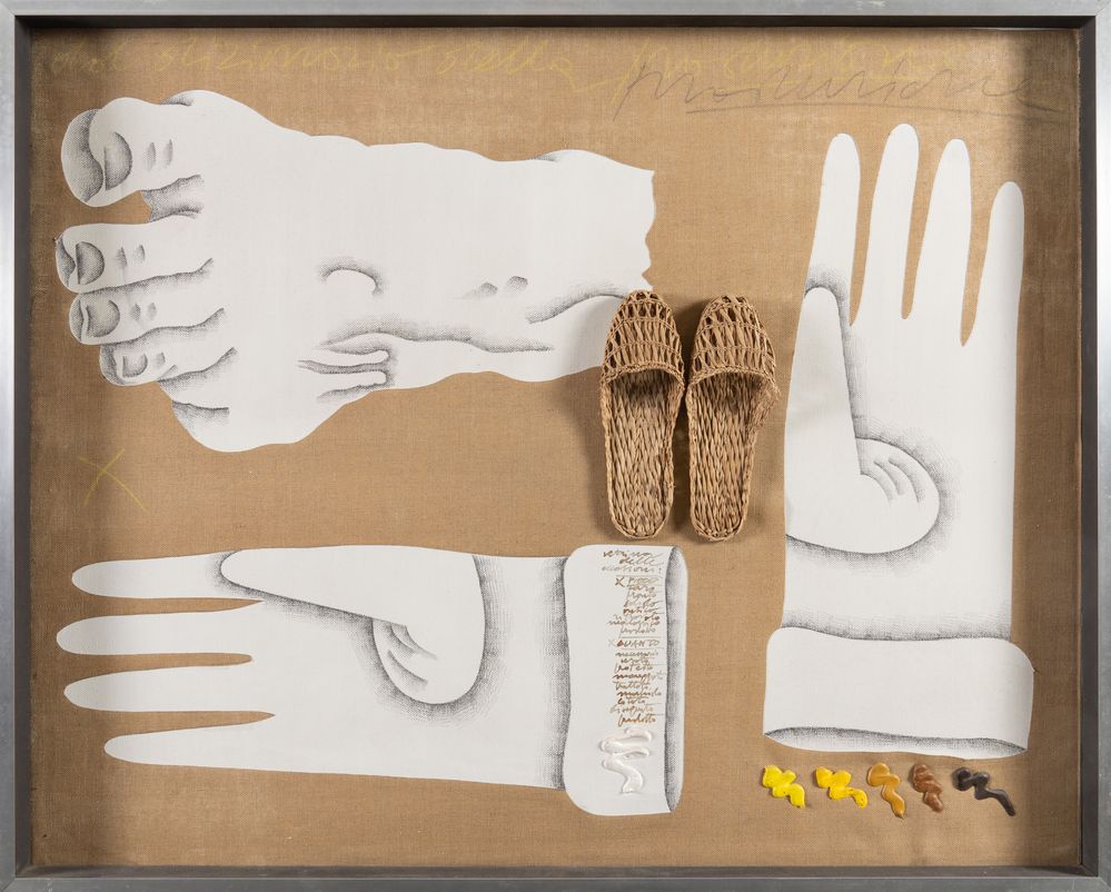 CONCETTO POZZATI (Vo' 1935 - Bologna 2017) "Vetrina delle occasioni", 1974. Olio e collage su tela grezza. Cm 80x100. Al retro opera firmata, datata e intitolata Pozzati '74, vetrina delle occasioni. opera accompagnata da autentica su foto della galleria Vinciana, Milano.