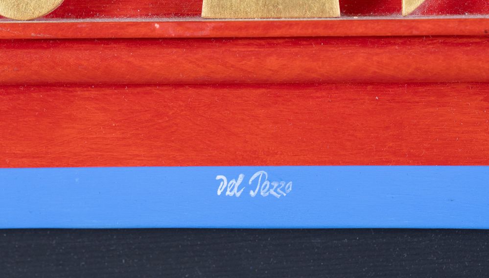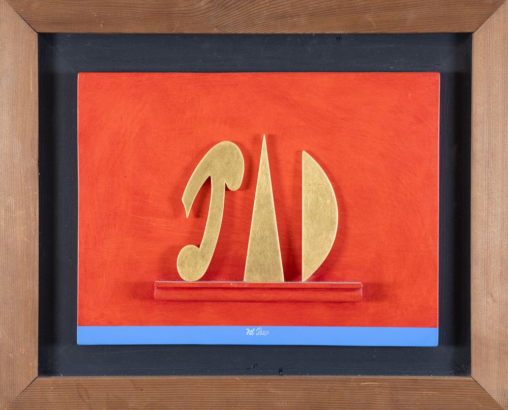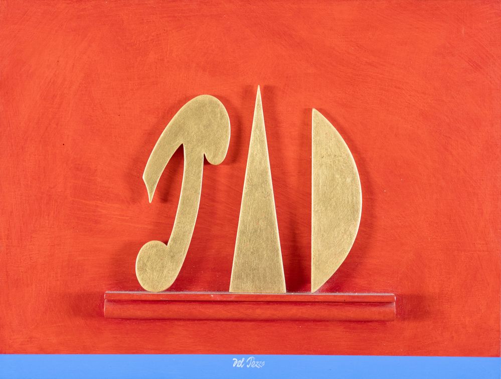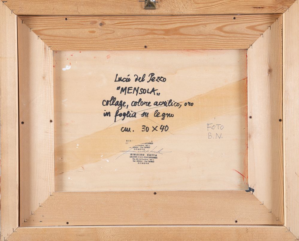 LUCIO DEL PEZZO (Napoli 1933 – Milano 2020) "Mensola". Collage, colore acrilico, oro in foglia su legno. Cm 30x40. Opera firmata in basso al centro Del Pezzo. Al retro opera firmata e intitolata Lucio Del Pezzo. Mensola. Al retro reca timbro della Galleria d'Arte Rinaldo Rotta, Genova, con firma Rinaldo Rotta. Opera accompagnata da autentica su fotografia con timbro della Galleria d'arte Rinaldo Rotta.