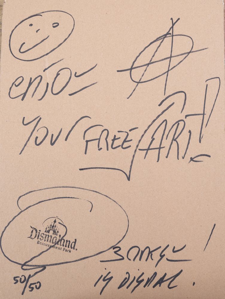 BANKSY (Bristol 1974) "Balloon girl". Spray su cartone. Cm 40x30. Reca firma stampata in basso a destra Banksy. Al retro reca numeri di tiratura 50/50. Al retro reca timbro Dismaland. Opera accompagnata da ticket d'ingresso a Dismaland.