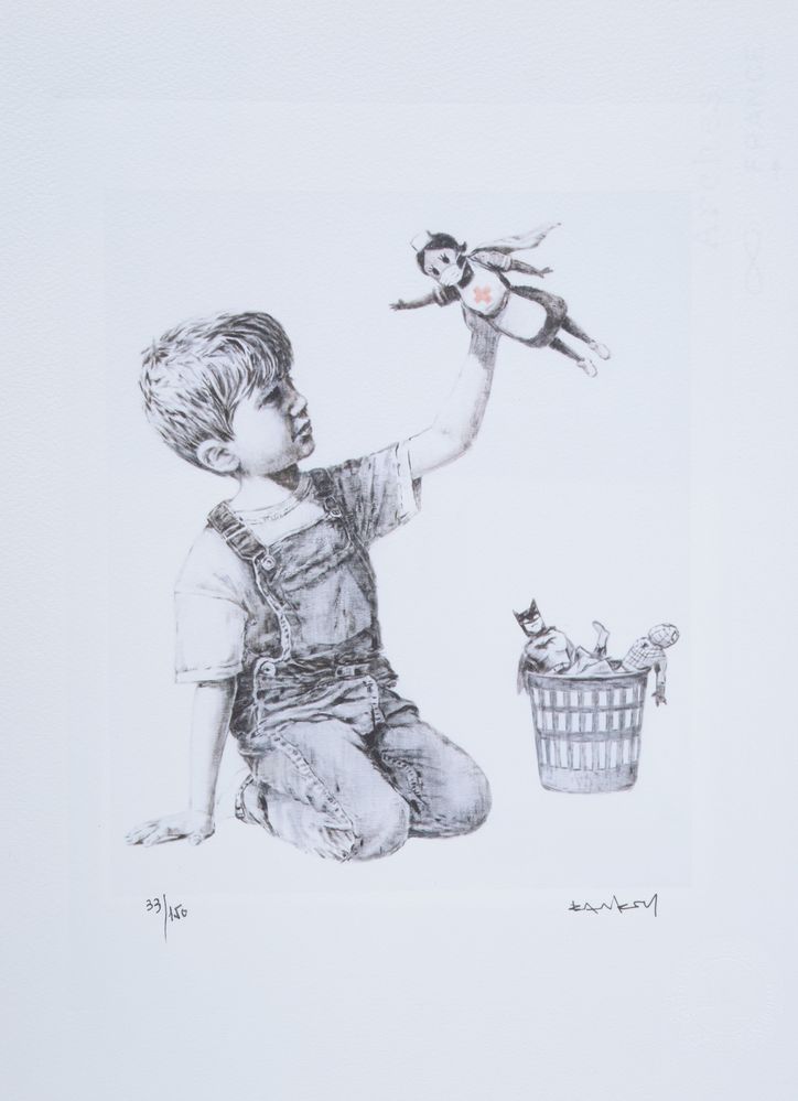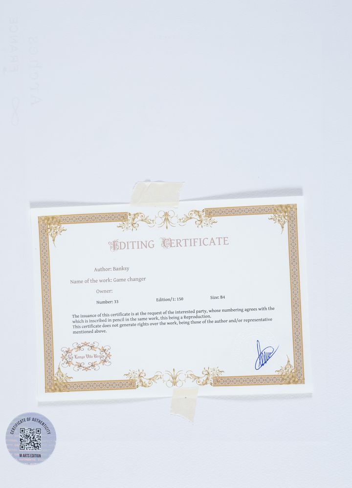 BANKSY (Bristol 1974), after. "Game changer". Litografia a colori su carta. Foglio: cm 38x28,5. Reca firma stampata in basso a destra Banksy. Reca numeri di tiratura in basso a sinistra 33/150. Reca in basso a destra timbro a secco di M Arts edition. Al retro reca sticker come certificato di autenticità di M Arts Edition. Opera accompagnata da certificato di autenticità di M Arts Edition.
