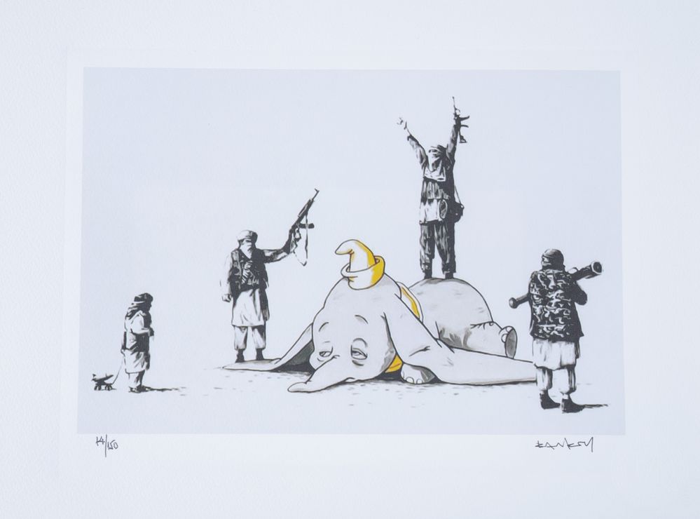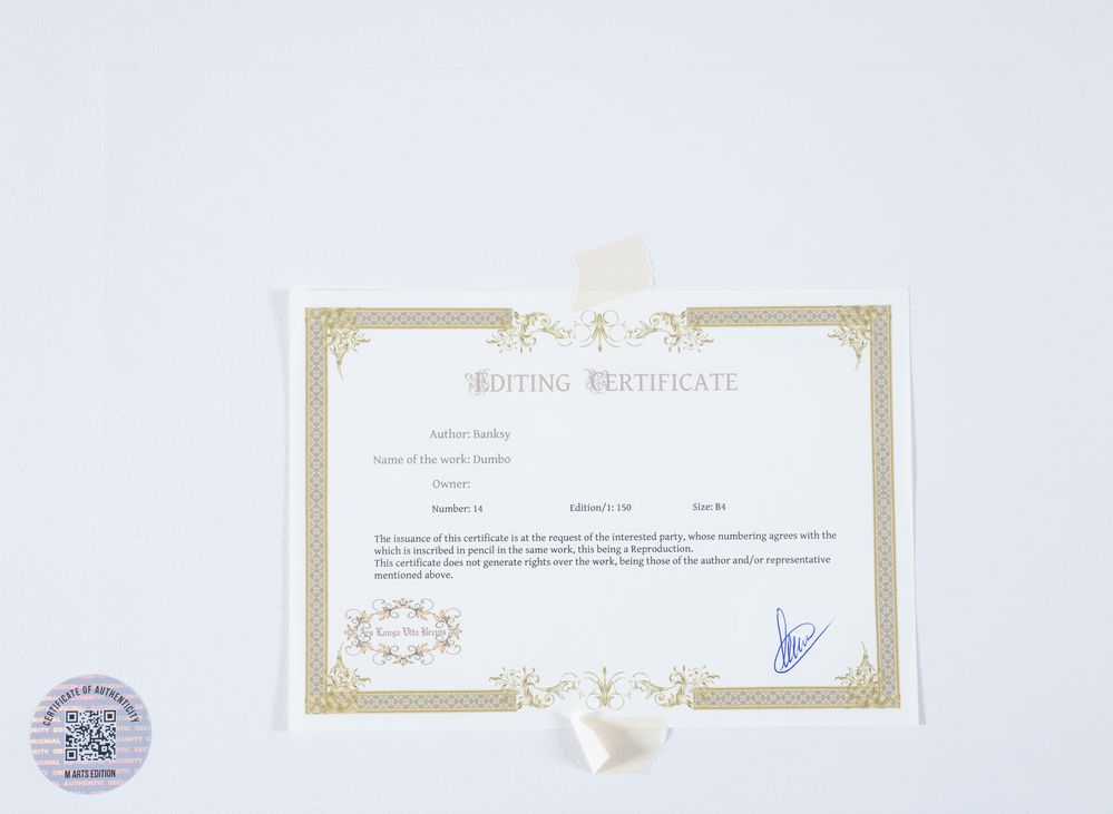 BANKSY (Bristol 1974), after. "Dumbo". Litografia a colori su carta. Cm foglio 38x28,5. Reca firma stampata in basso a destra Banksy. Reca numeri di tiratura in basso a sinistra 14/150. Reca in basso a destra timbro a secco di M Arts edition. Al retro reca sticker come certificato di autenticità di M Arts Edition. Opera accompagnata da certificato di autenticità di M Arts Edition.