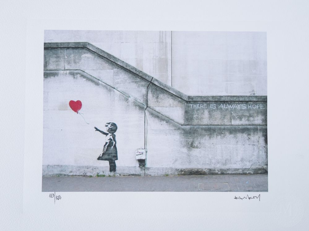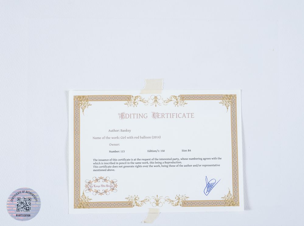 BANKSY (Bristol 1974), after. "Girl with a red balloon", 2014. Litografia a colori su carta. Cm foglio 38x28,5. Reca firma stampata in basso a destra Banksy. Reca numeri di tiratura in basso a sinistra 113/150. Reca in basso a destra timbro a secco di M Arts edition. Al retro reca sticker come certificato di autenticità di M Arts Edition. Opera accompagnata da certificato di autenticità di M Arts Edition.