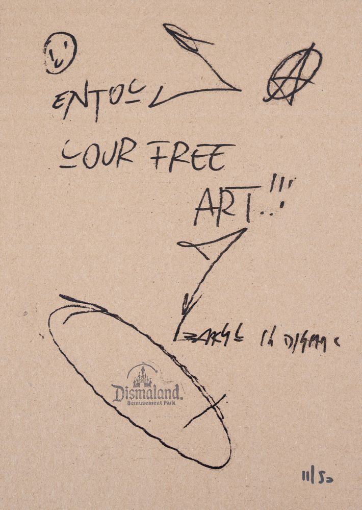 BANKSY (Bristol 1974) "No War x Irak", 2015. Spray su cartone. Cm 30x21. Reca firma stampata in basso a destra Banksy. Al retro reca numeri di tiratura 11/50. Al retro reca timbro Dismaland. Opera accompagnata da ticket d'ingresso Dismaland.