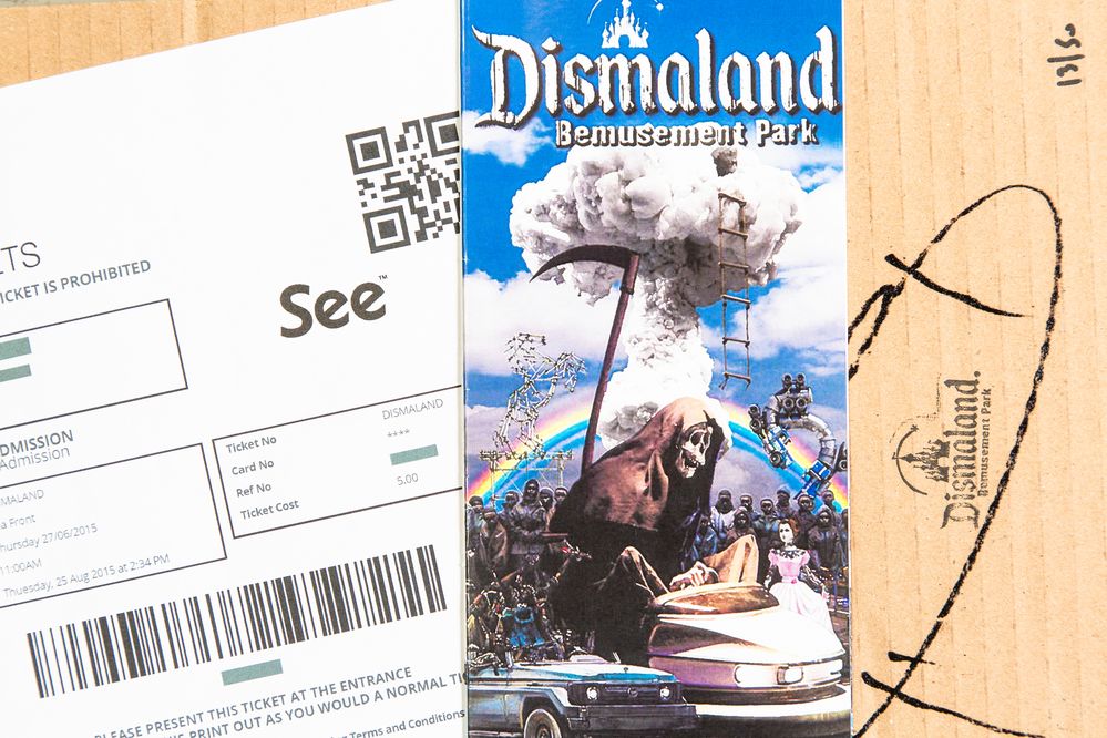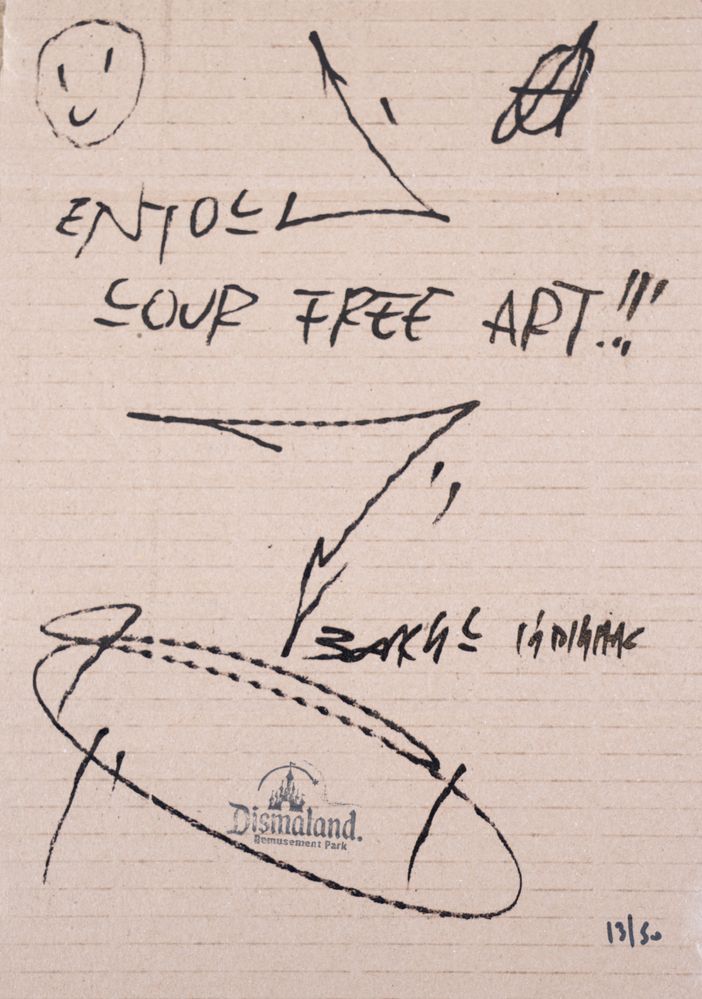 BANKSY (Bristol 1974) "Police", 2015. Spray su cartone. Cm 30x21. Reca firma stampata in basso a destra Banksy. Al retro reca numeri di tiratura 13/50. Al retro reca timbro Dismaland. Opera accompagnata da ticket d'ingresso Dismaland.