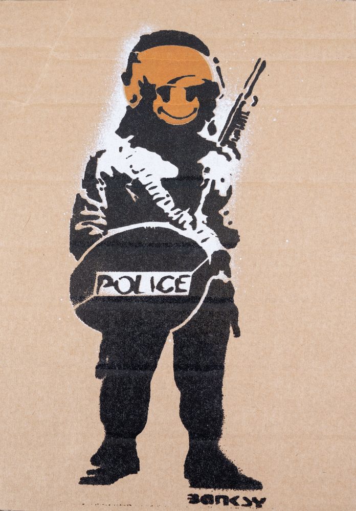 BANKSY (Bristol 1974) "Police", 2015. Spray su cartone. Cm 30x21. Reca firma...