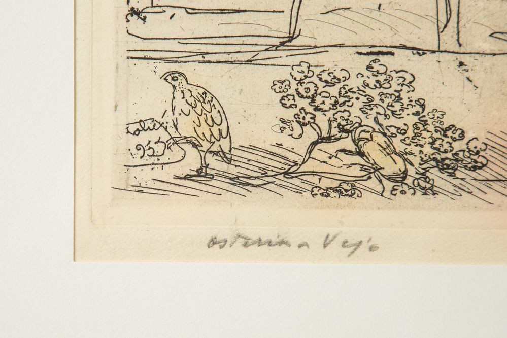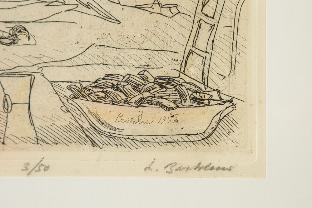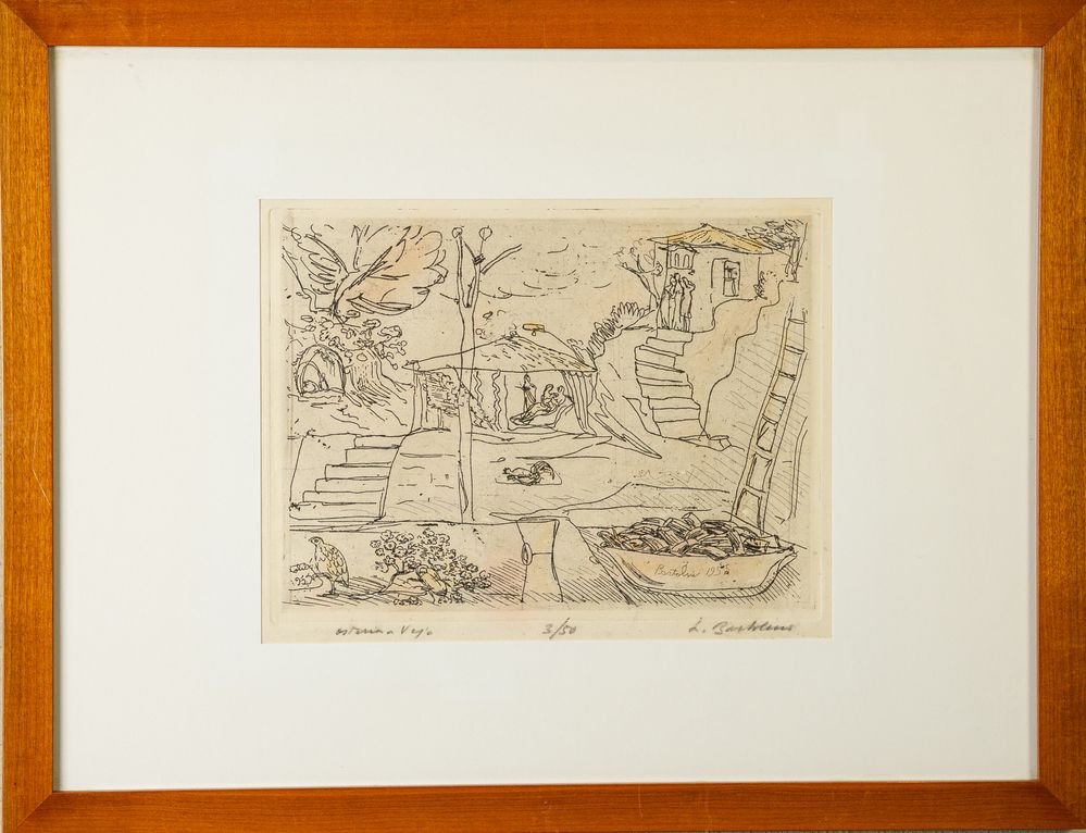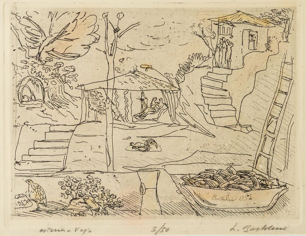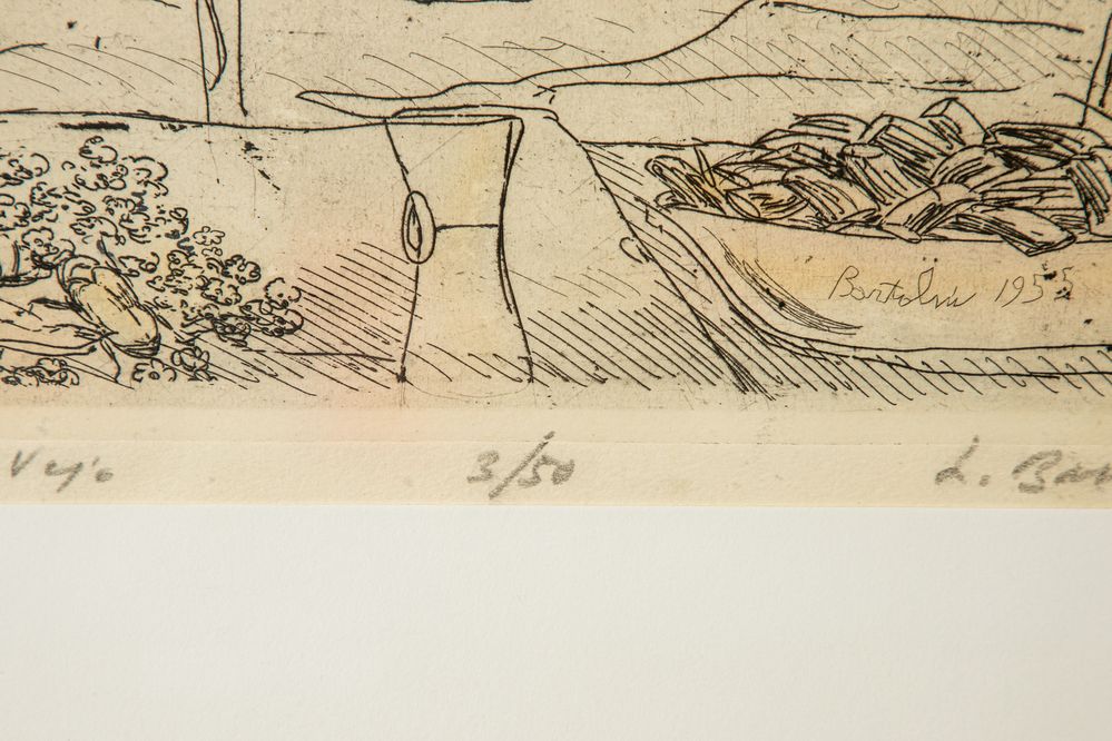 LUIGI BARTOLINI (Cupramontana 1892 - Roma 1963) "Osteria a Vejo", 1955. Incisione su carta. Cm 25,5 x 33,5. Opera firmata in basso a destra L. Bartolini. Reca numeri di tiratura in basso al centro 3/50. Opera intitolata in basso a sinistra Osteria a Vejo.