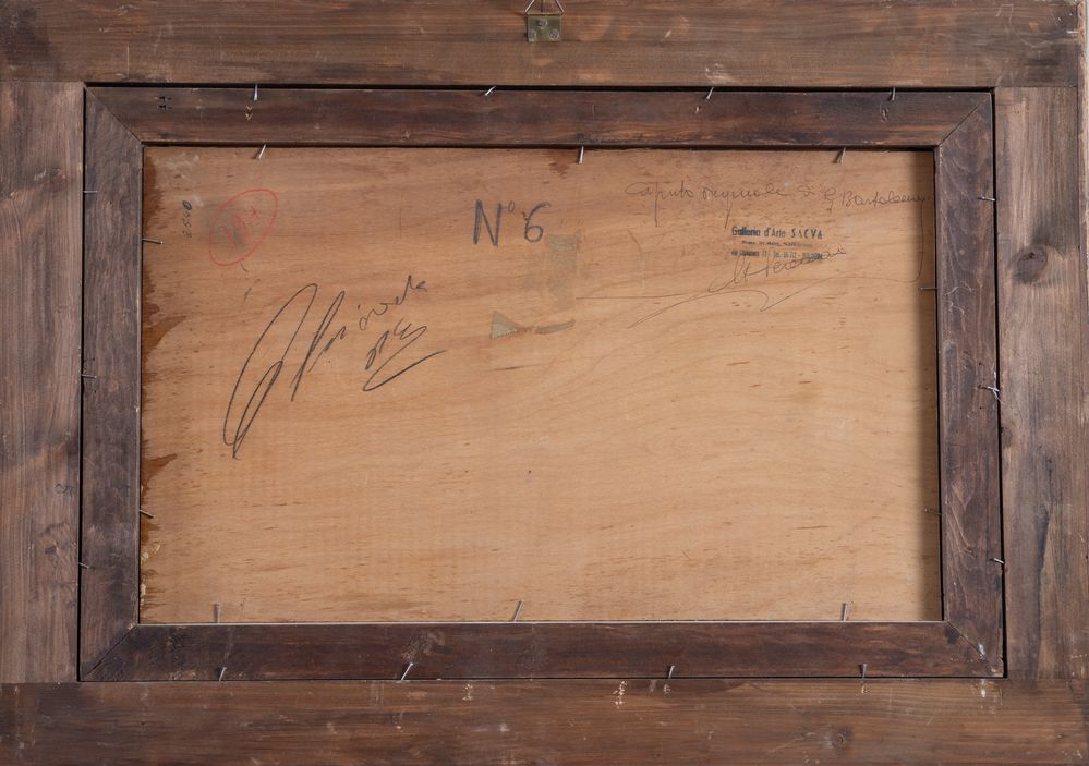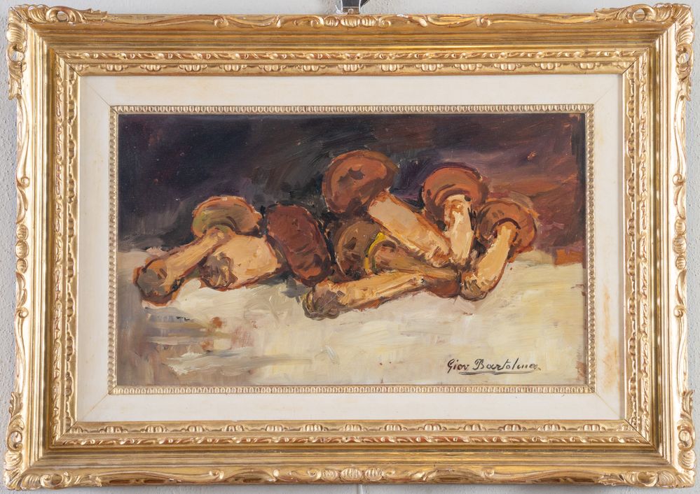 GIOVANNI BARTOLENA (Livorno 1866 - 1942) "Funghi". Olio su tavola. Cm 29x50. Opera firmata in basso a destra Giov. Bartolena. Al retro reca firmata per autentica. Al retro reca timbro della Galleria d'Arte SACVA, Bologna.