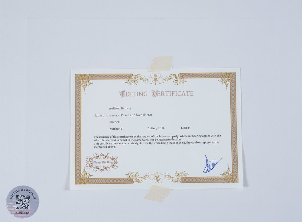 BANKSY (Bristol 1974), after. "Peace and love doctor". Litografia a colori su carta. Cm foglio 38x28,5. Reca firma stampata in basso a destra Banksy. Reca numeri di tiratura in basso a sinistra 11/150. Reca in basso a destra timbro a secco di M Arts edition. Al retro reca sticker come certificato di autenticità di M Arts Edition. Opera accompagnata da certificato di autenticità di M Arts Edition.