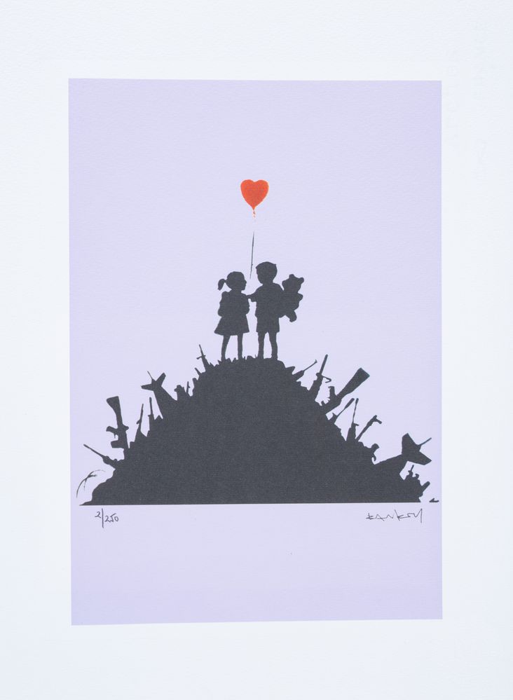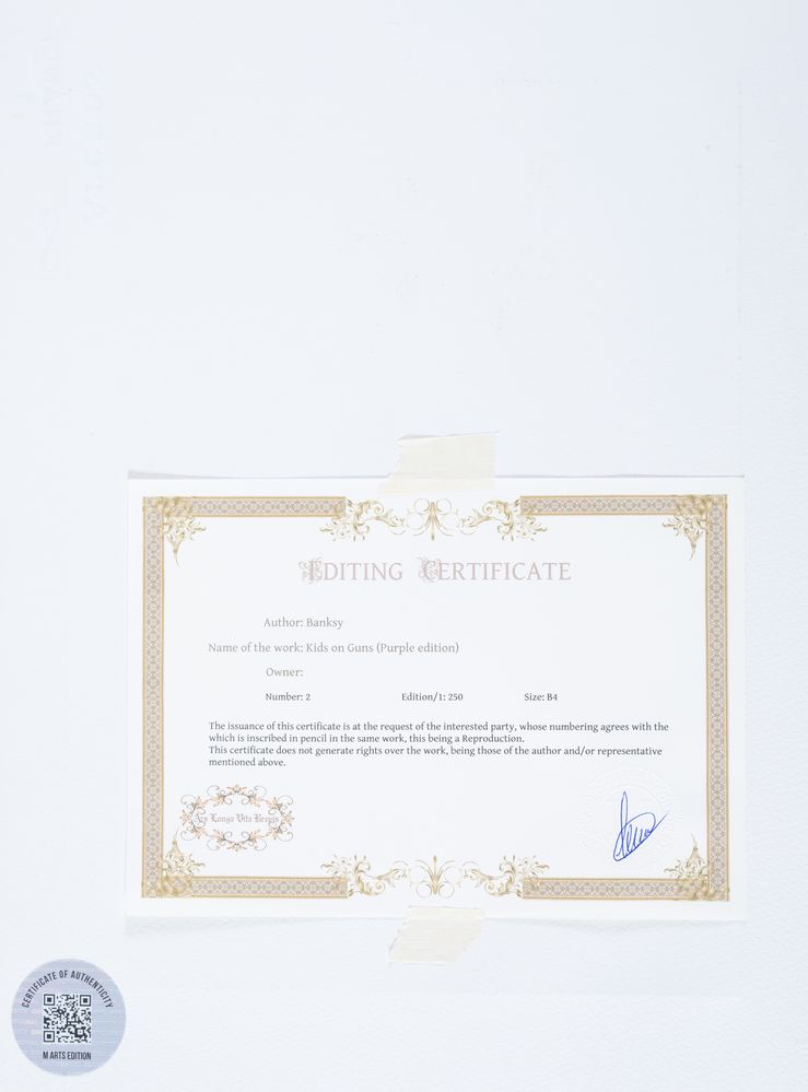 BANKSY (Bristol 1974), after. "Kids on Guns (Purple edition)". Litografia a colori su carta. Cm Cm foglio 38x28,5. Reca firma stampata in basso a destra Banksy. Reca numeri di tiratura in basso a sinistra 2/250. Reca in basso a destra timbro a secco di M Arts edition. Al retro reca sticker come certificato di autenticità di M Arts Edition. Opera accompagnata da certificato di autenticità di M Arts Edition.