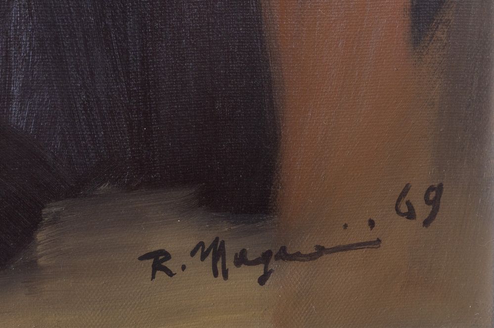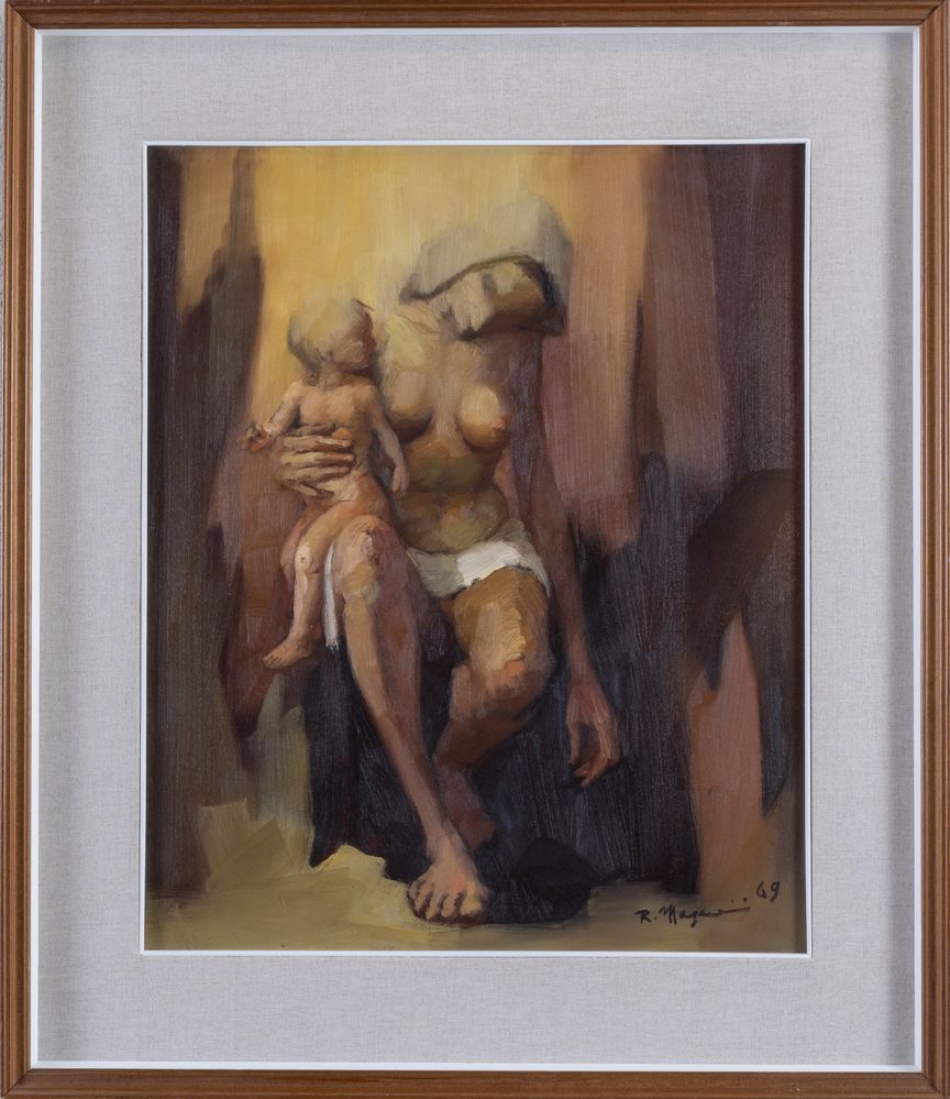 RENZO MAGNANINI (Gonzaga 1920 – Bentivoglio 2006) "Maternità", 1969. Olio su tela. Cm 52x43. Opera firmata e datata in basso a destra R. Magnanini 69.
