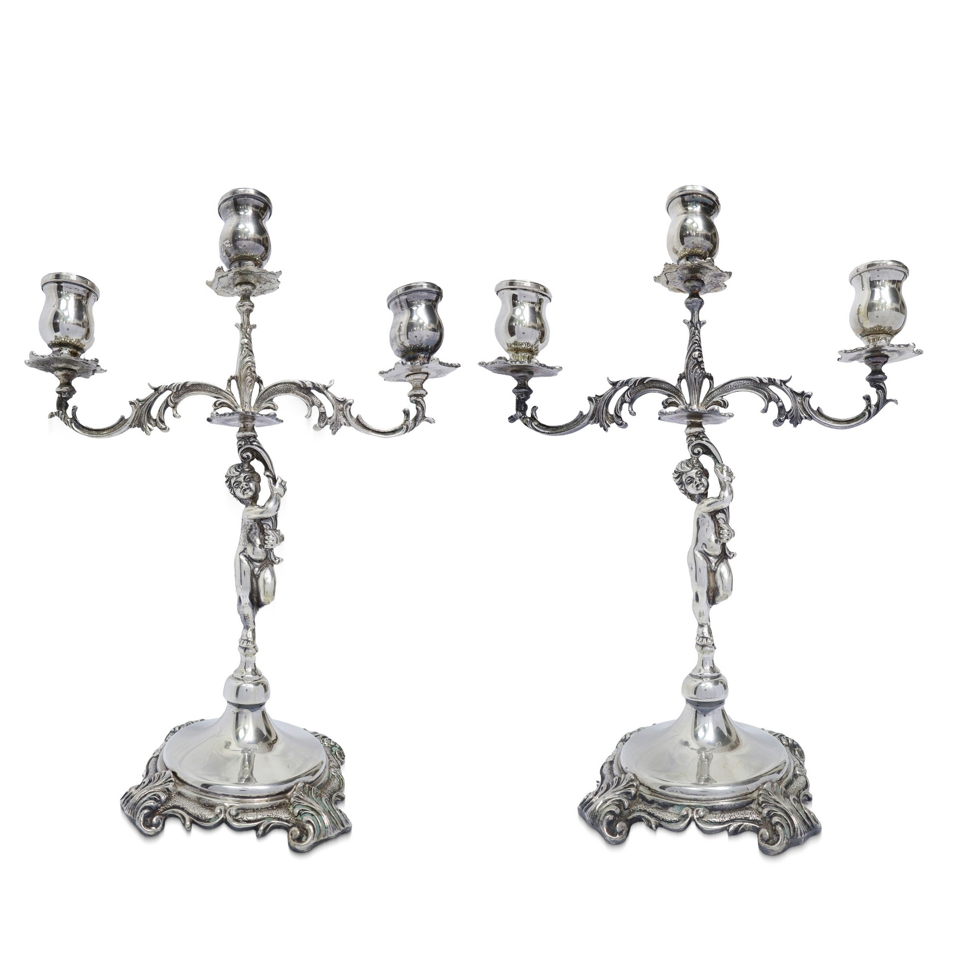 Coppia di candelabri in argento a tre luci con putti a sostegno