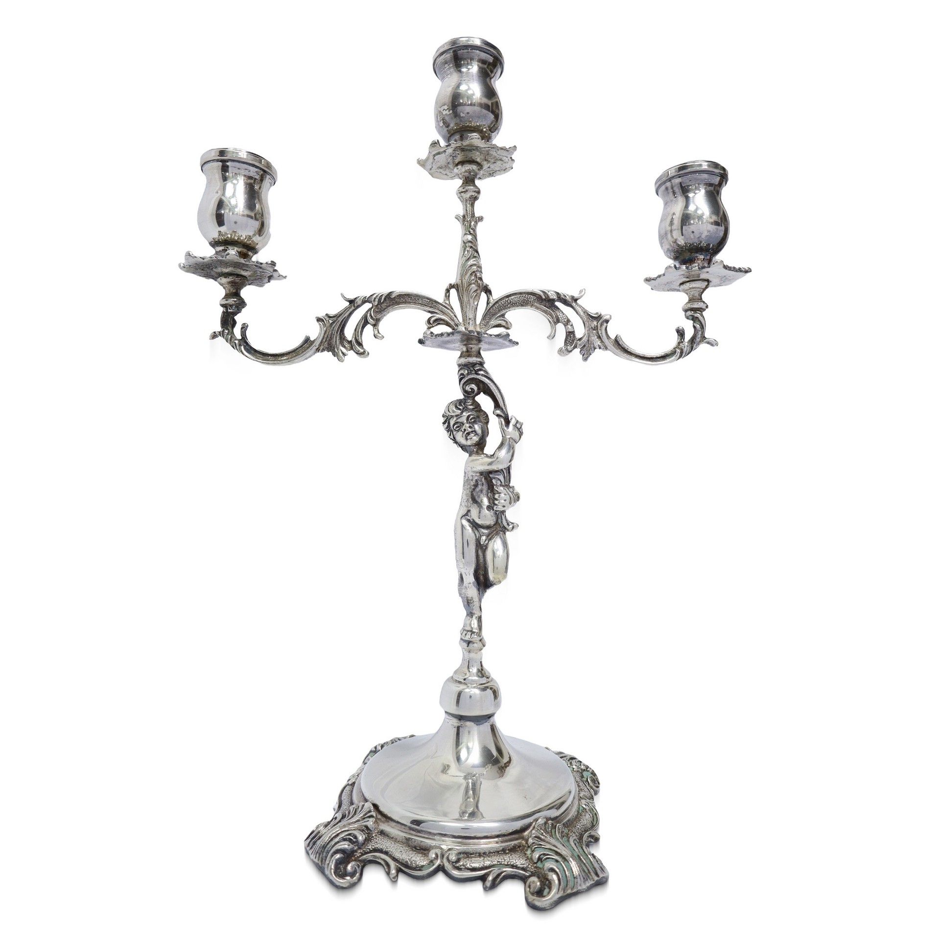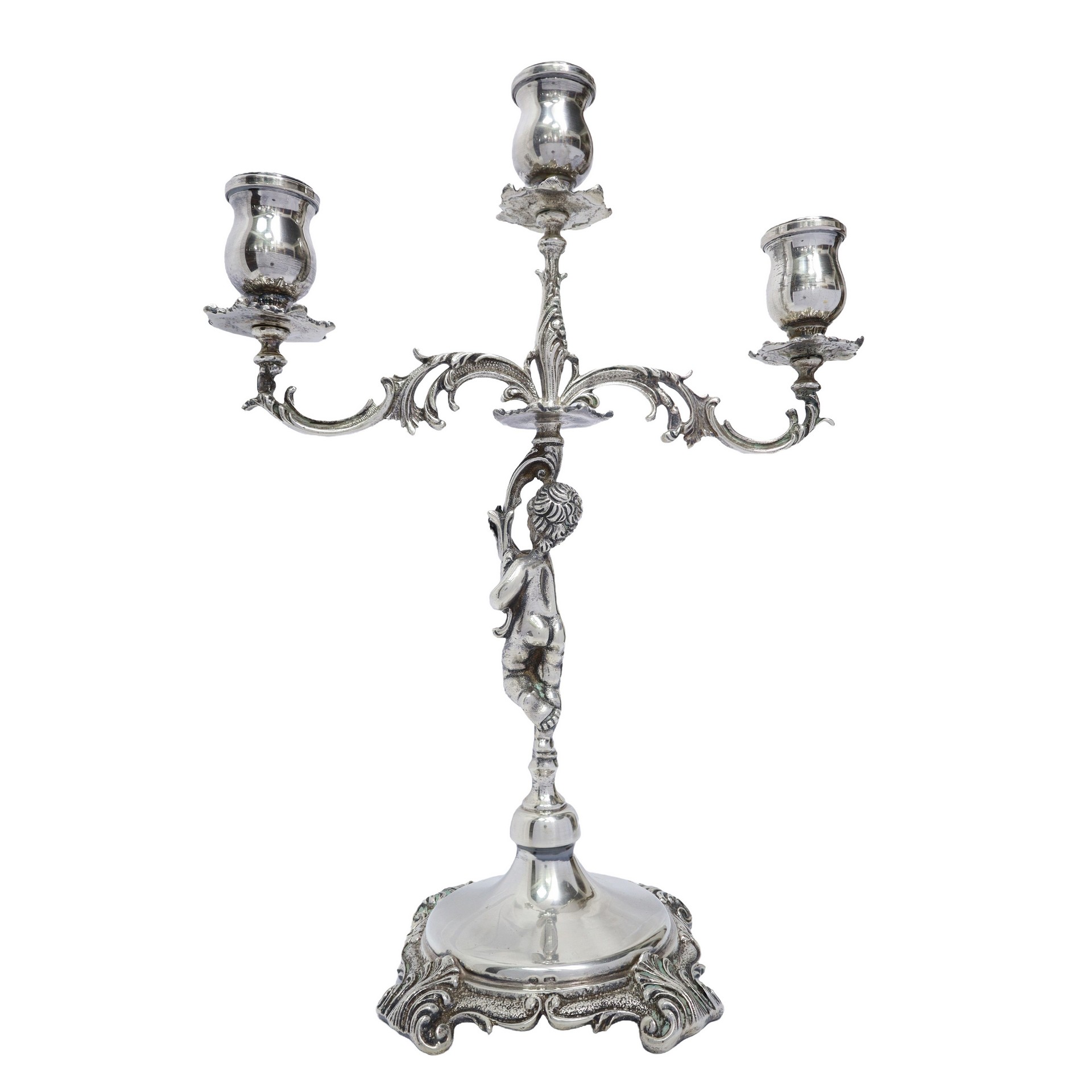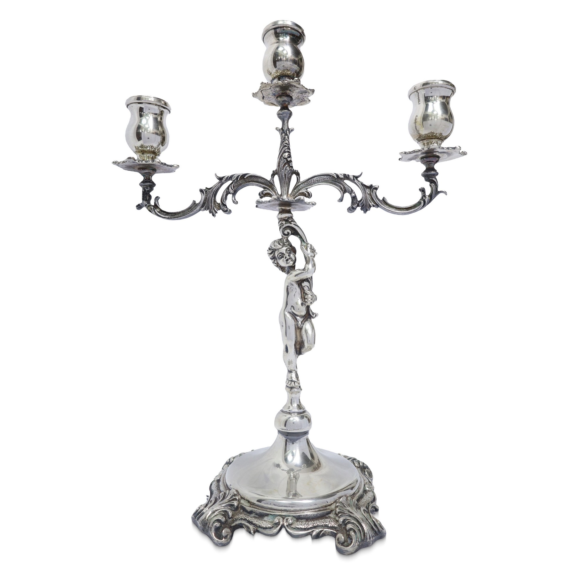 Coppia di candelabri in argento a tre luci con putti a sostegno kg 1,992