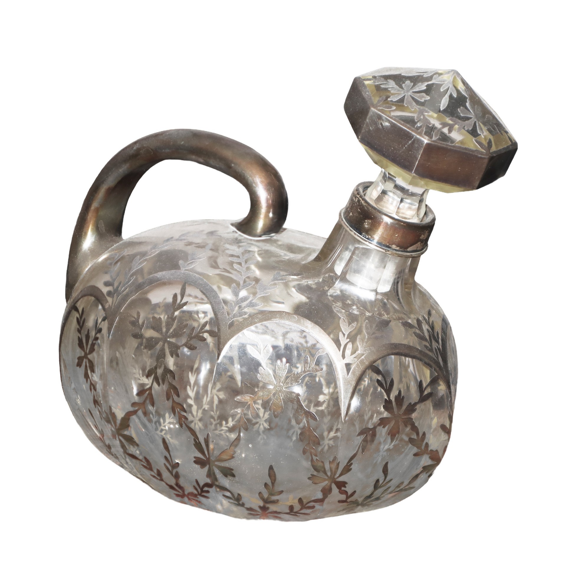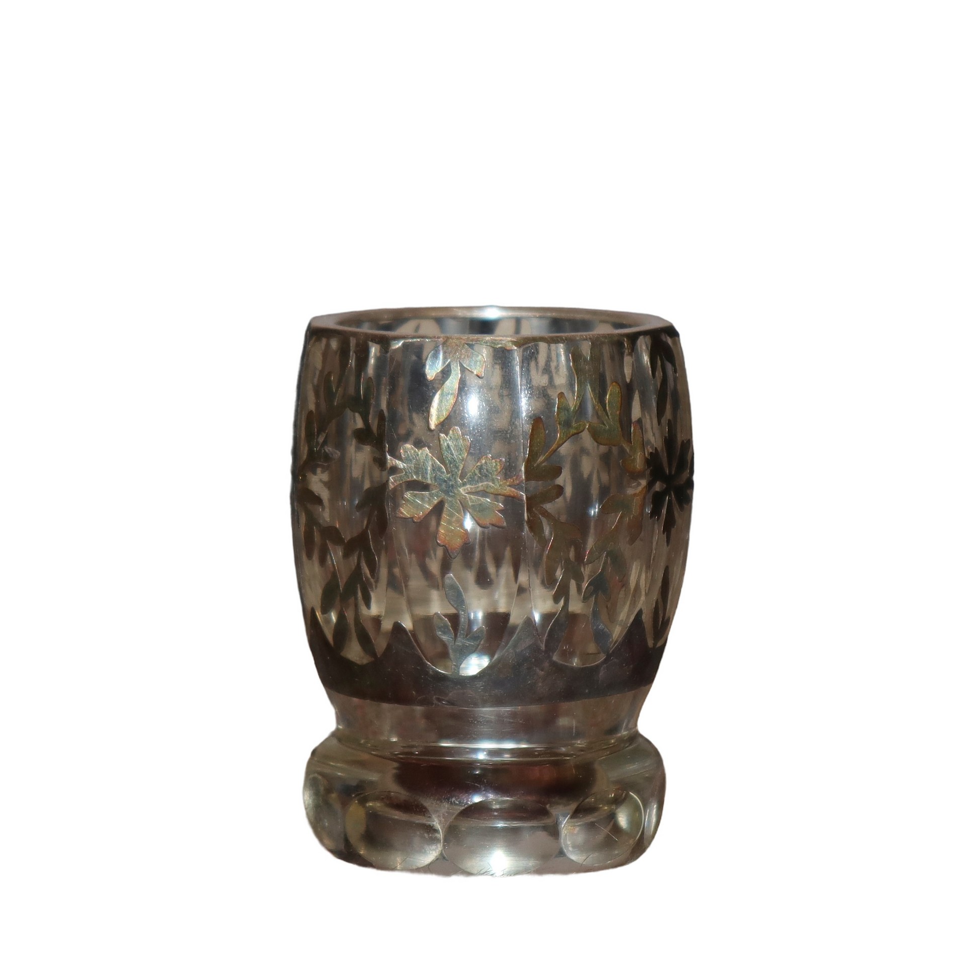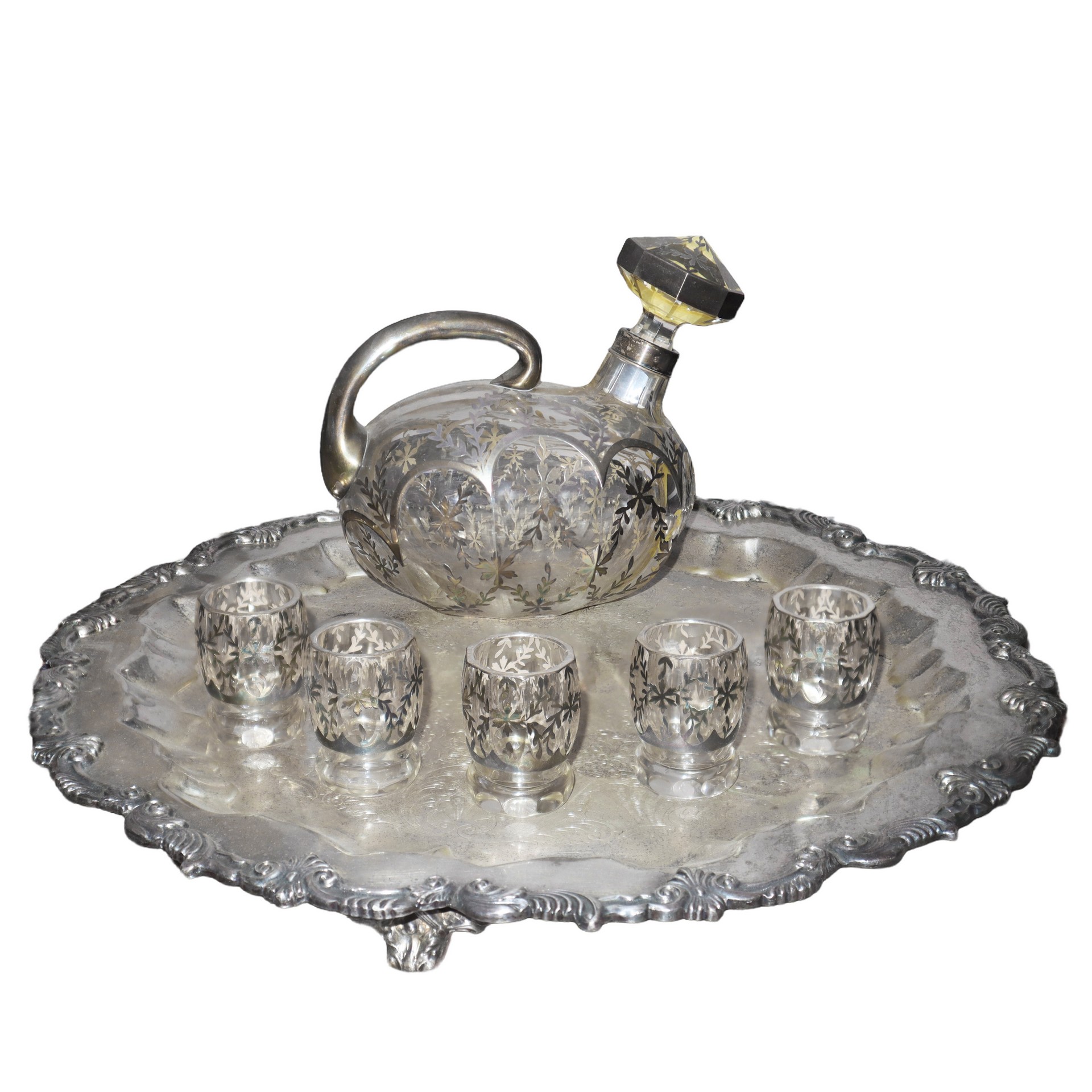 Set da liquore composto da Bottiglia in cristallo decorato in foglia argento, 5 bicchierini e vassoi