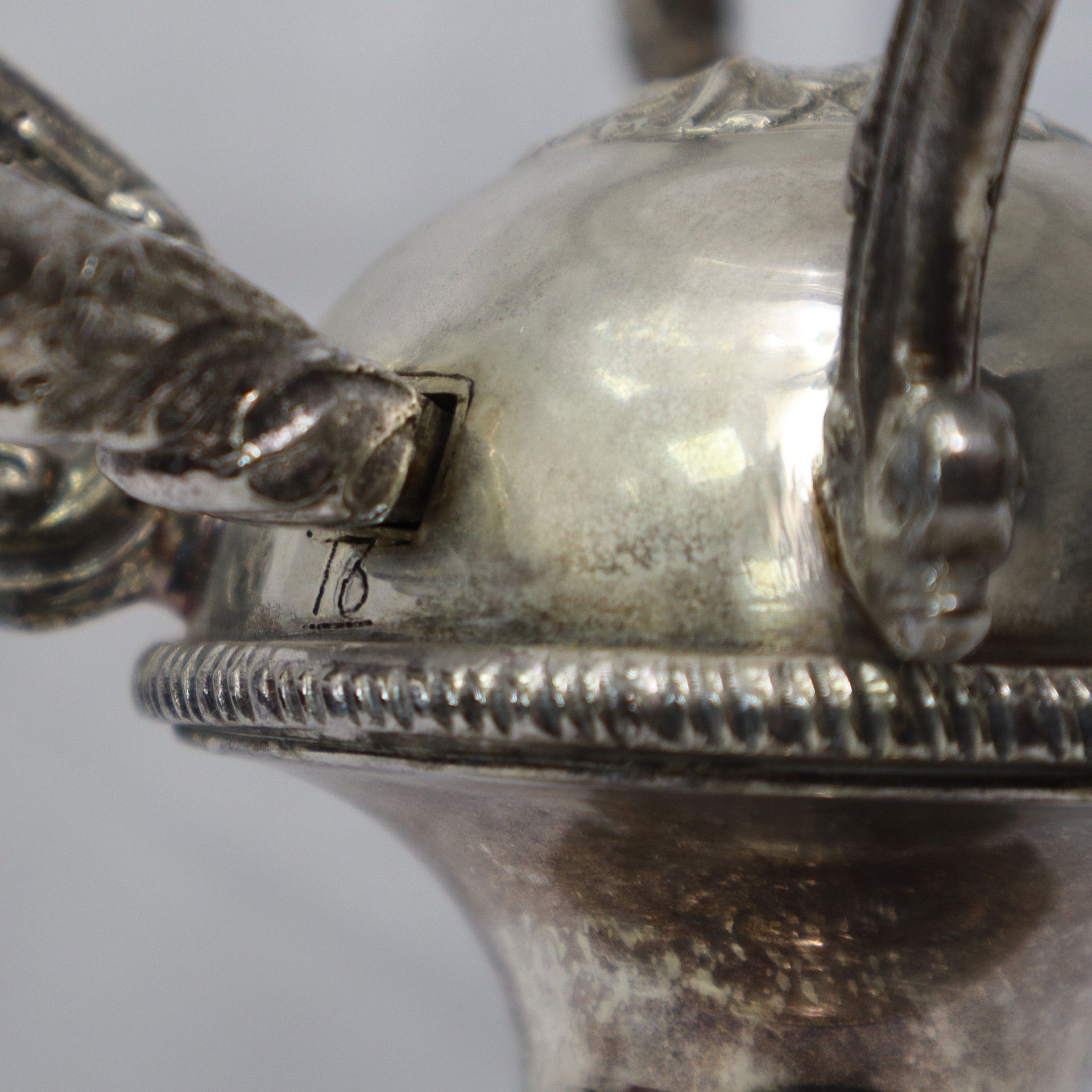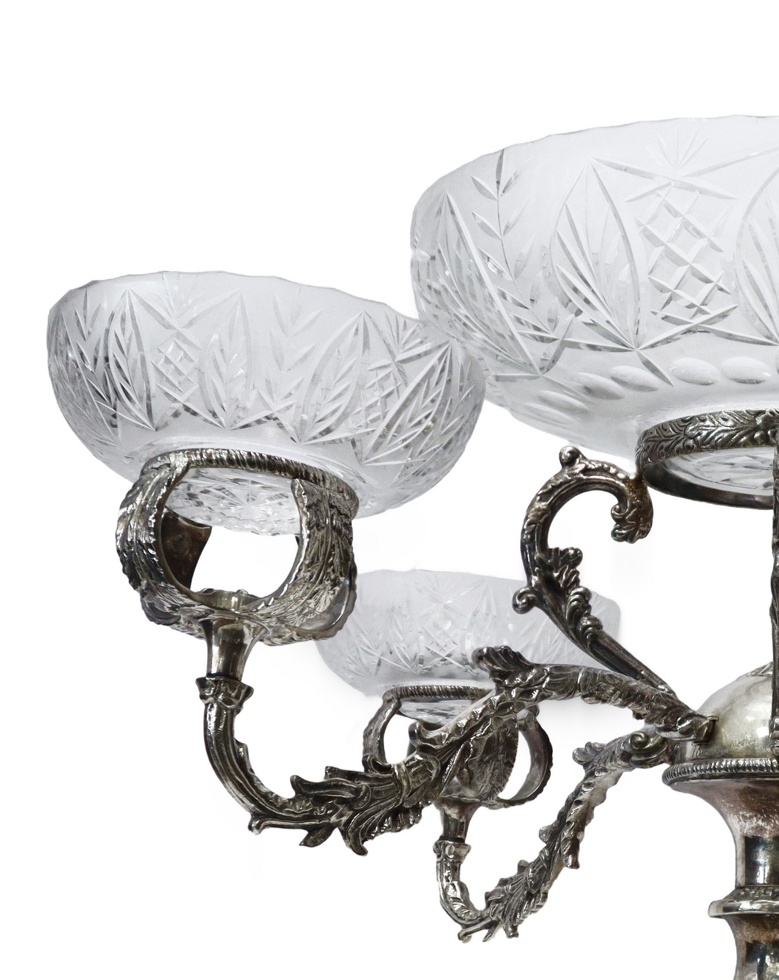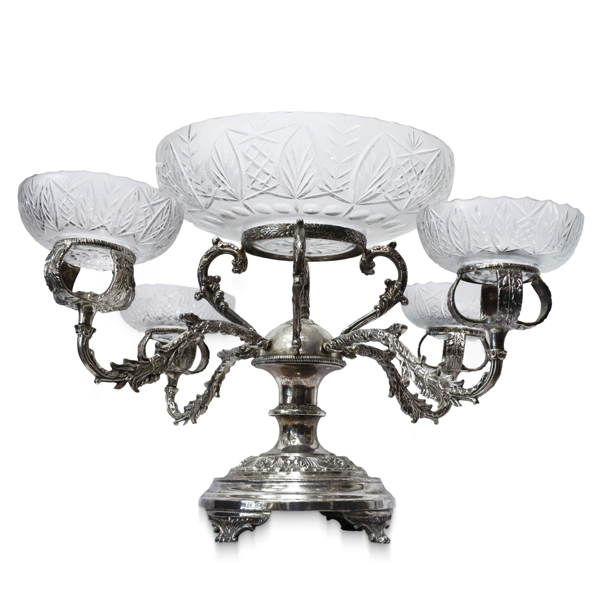 Centrotavola in metallo argentato e vetro intagliato a quattro bracci