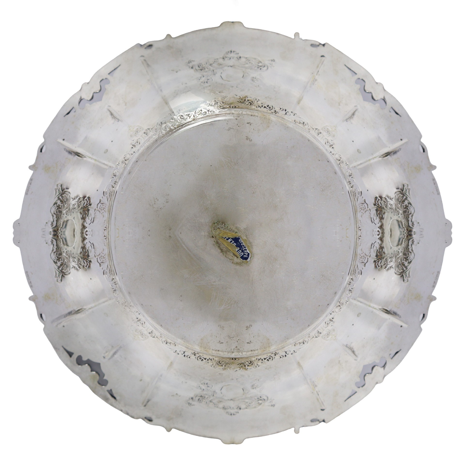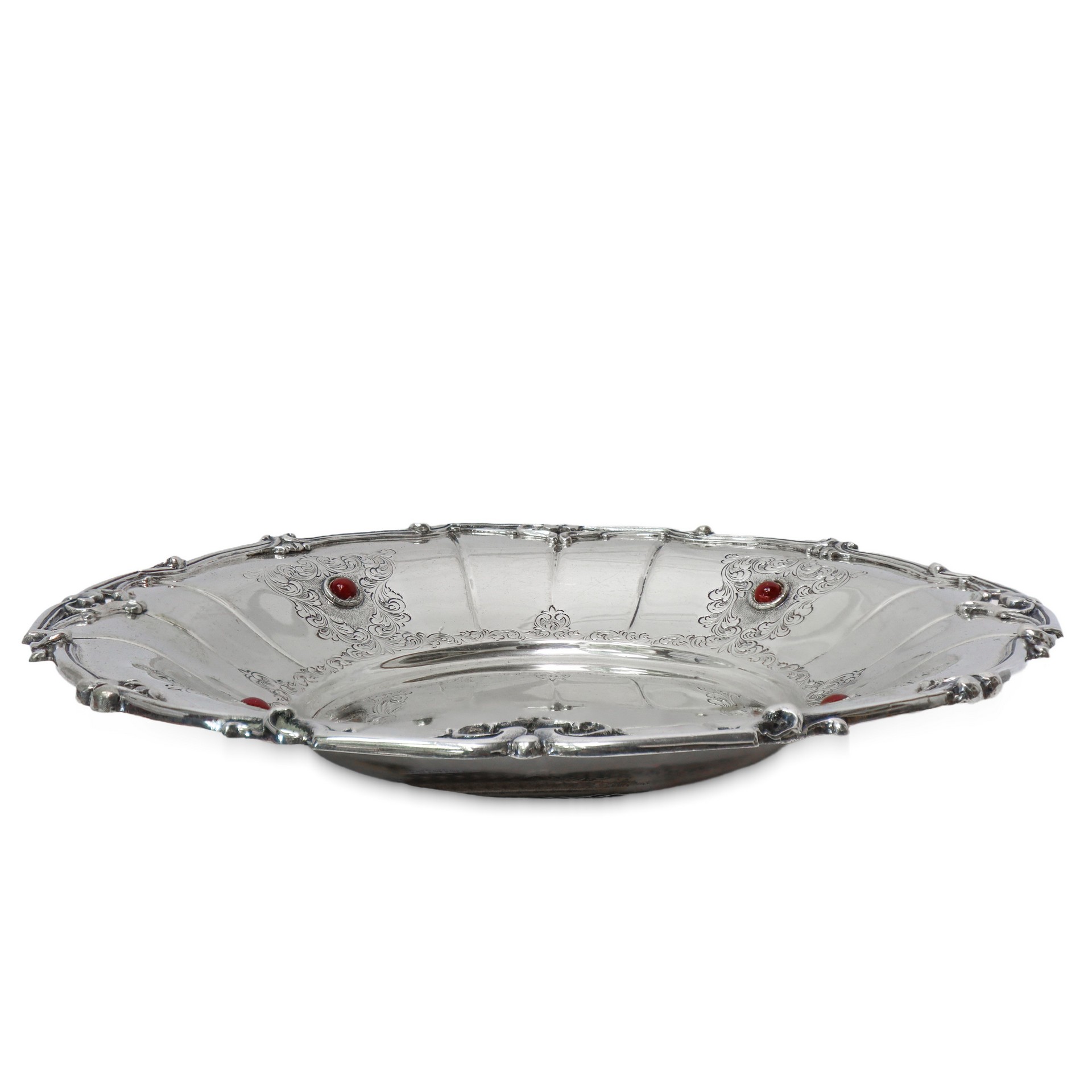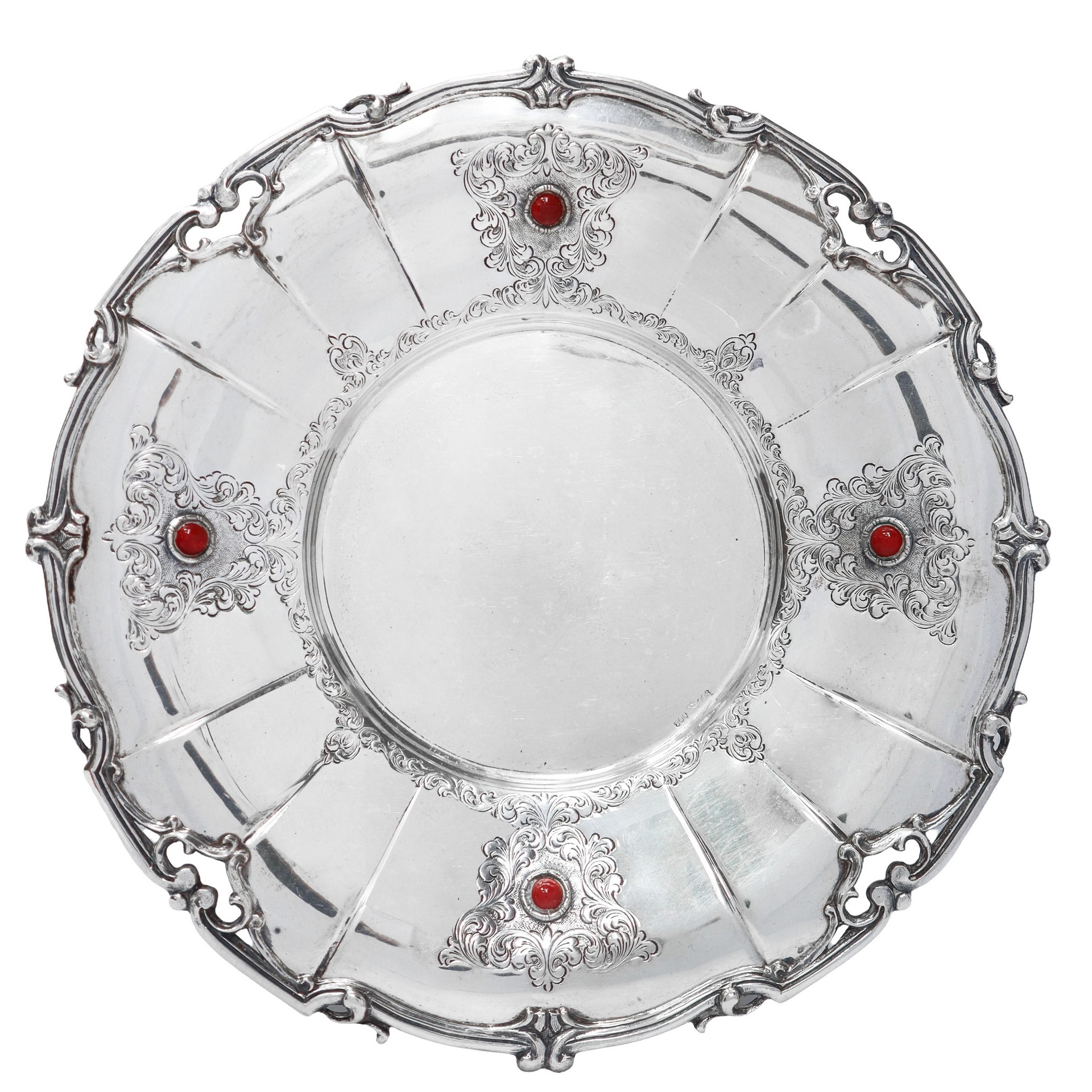 Vassoio in argento rotondo, bordo smerlato, corniola applicata, al centro di bulinature barocche