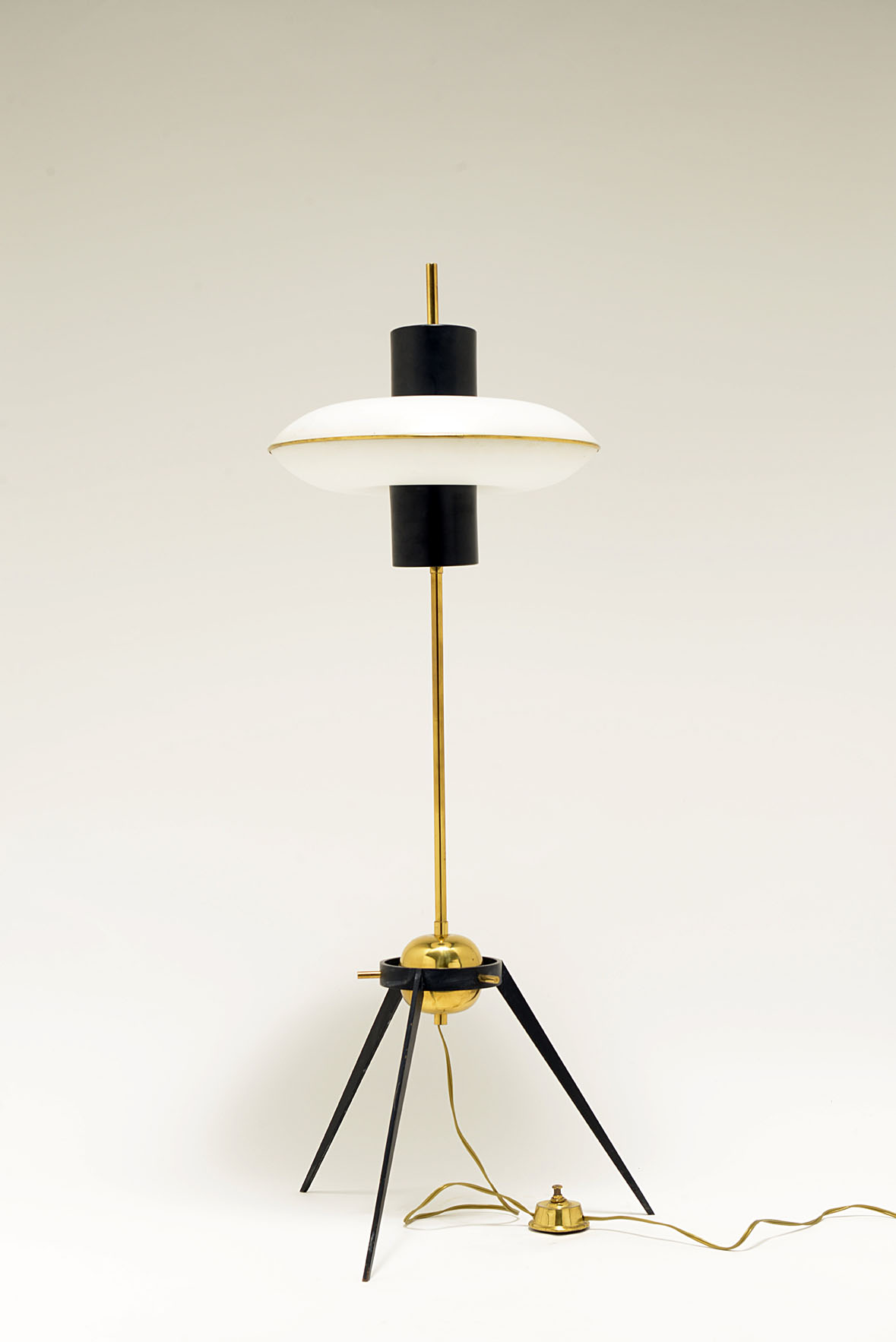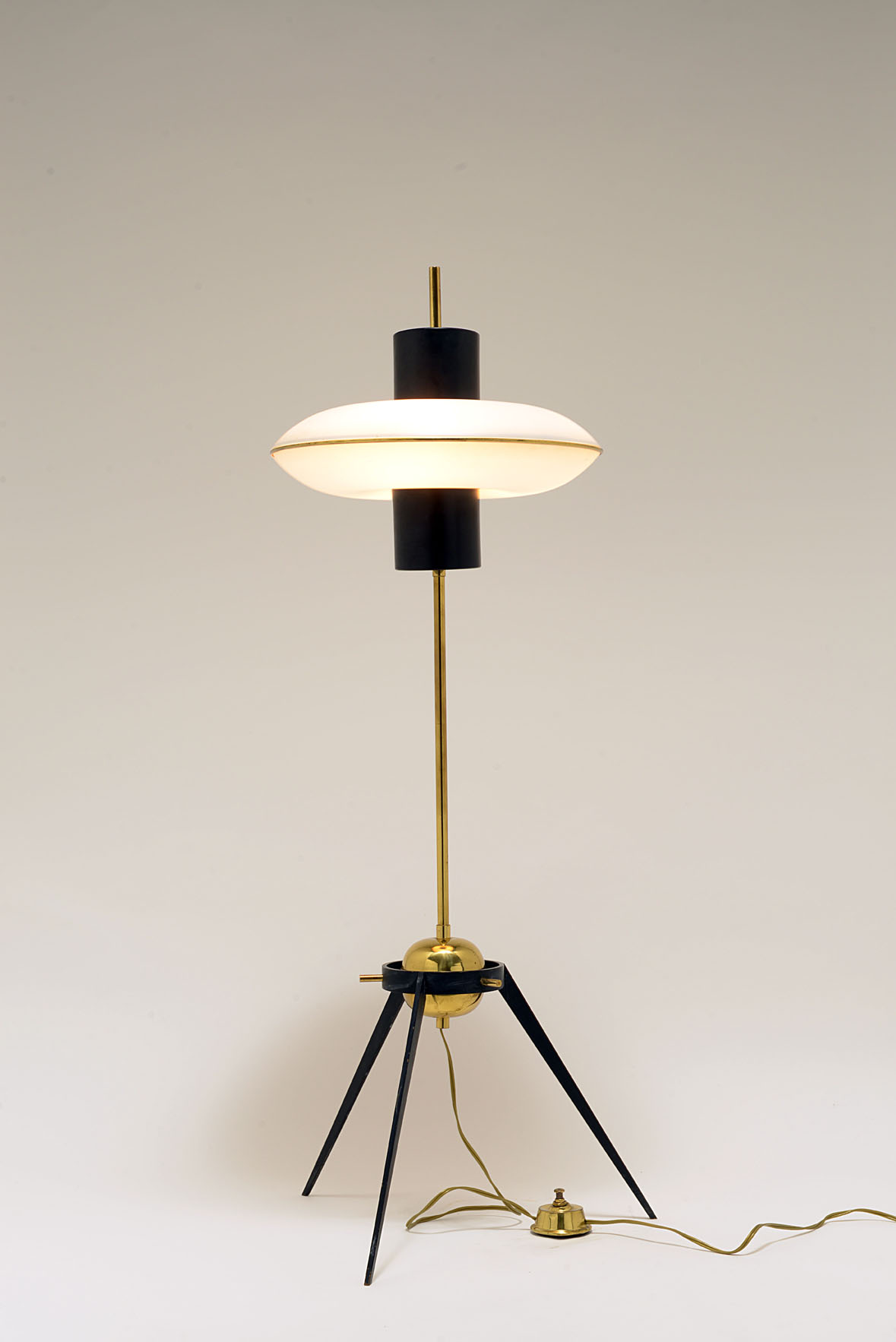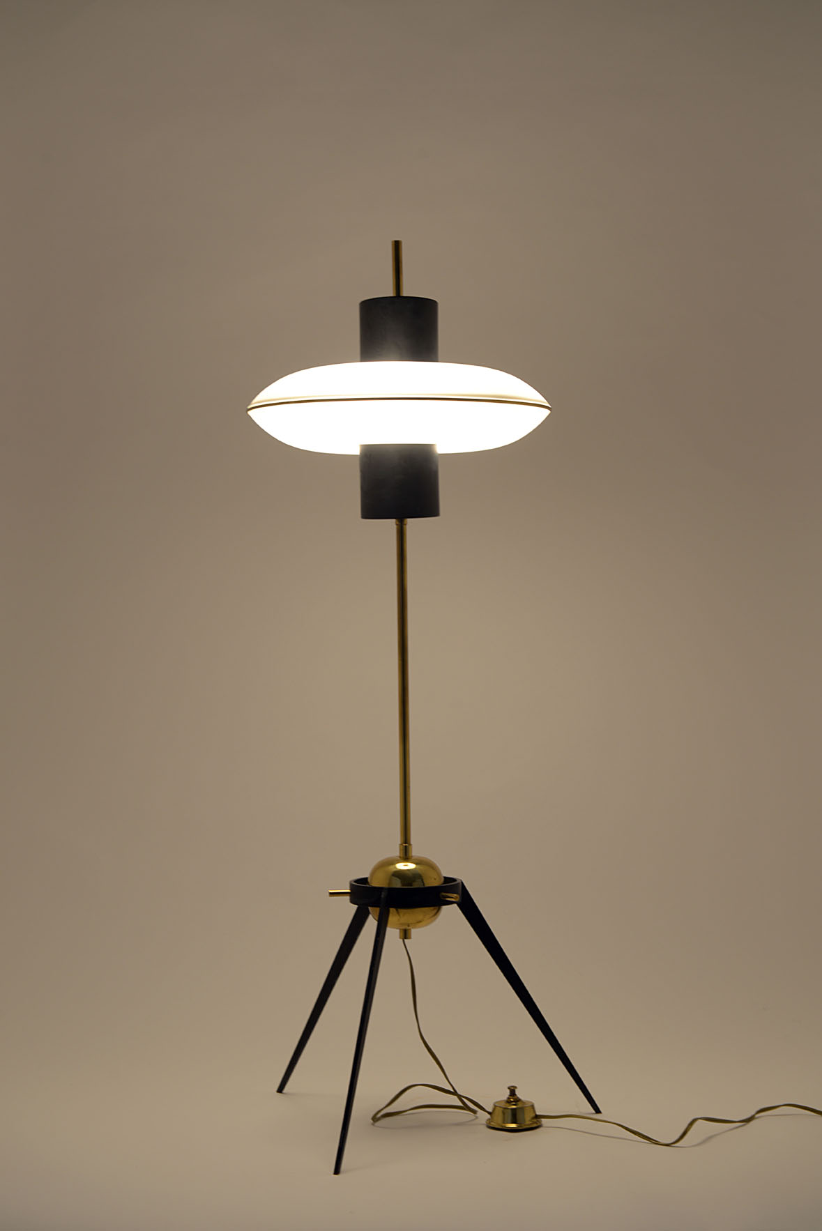 Lamp with black varnished metal tripod foot. A slightly tilting shade is fixed towards the top of the stem, that consists of two white opaline glass discs, shaped like a flying saucer, and which contains three bulbs. The theme of 'space' is clearly referred to in this example and it inspired many lamps designed in the 1950's and 1960's.