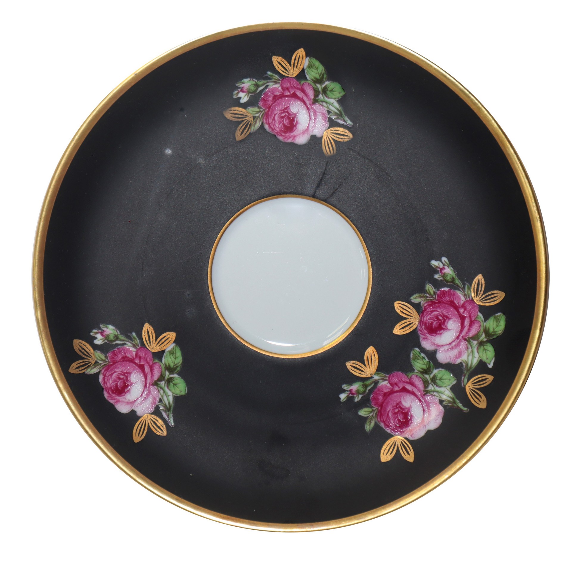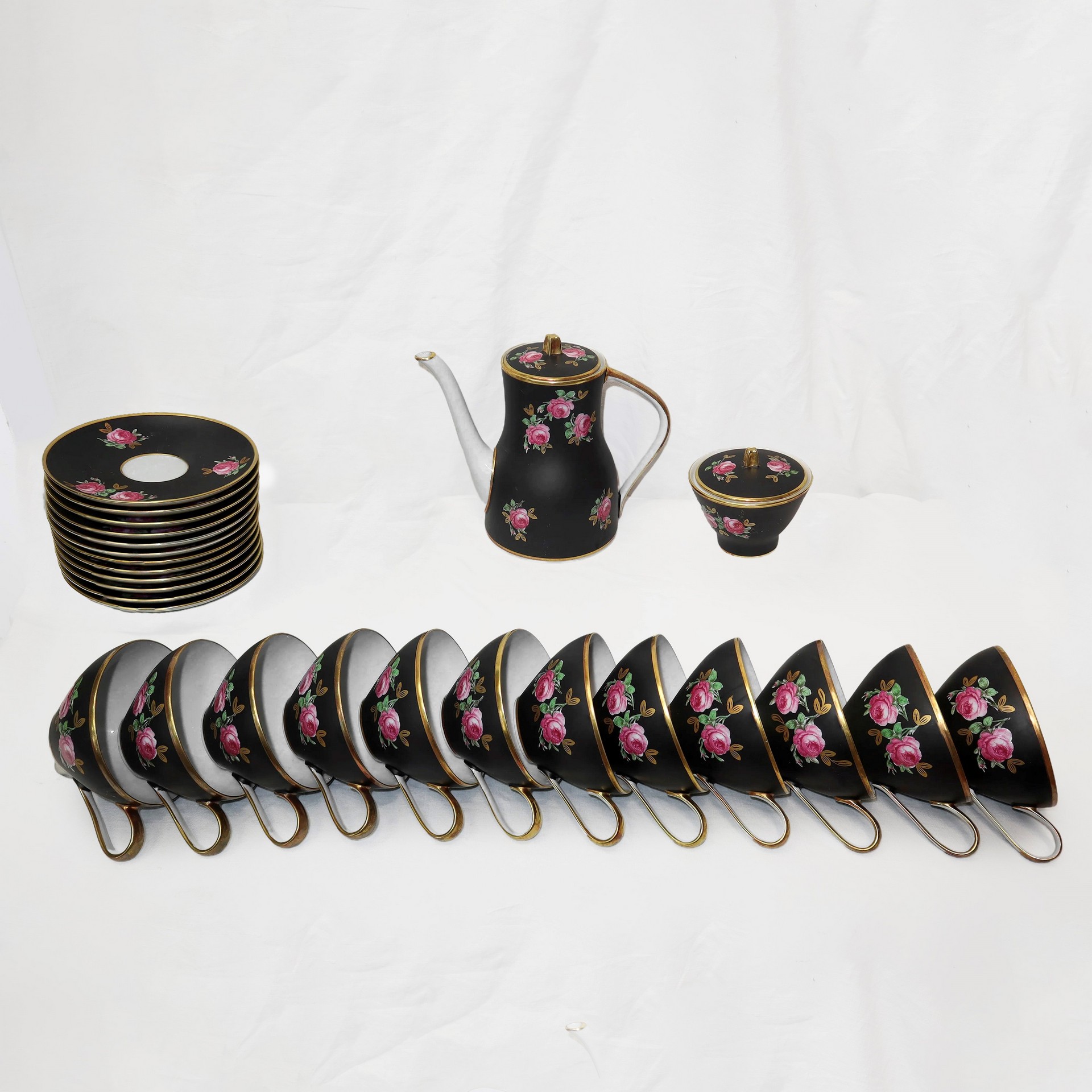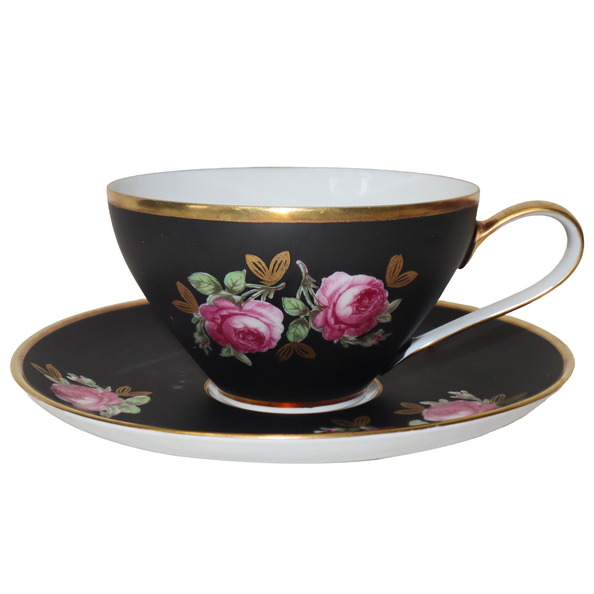 Sevres- Vincennes - Servizio da 12 da te in porcellana smaltata in nero opaco con rose fucsia, detta