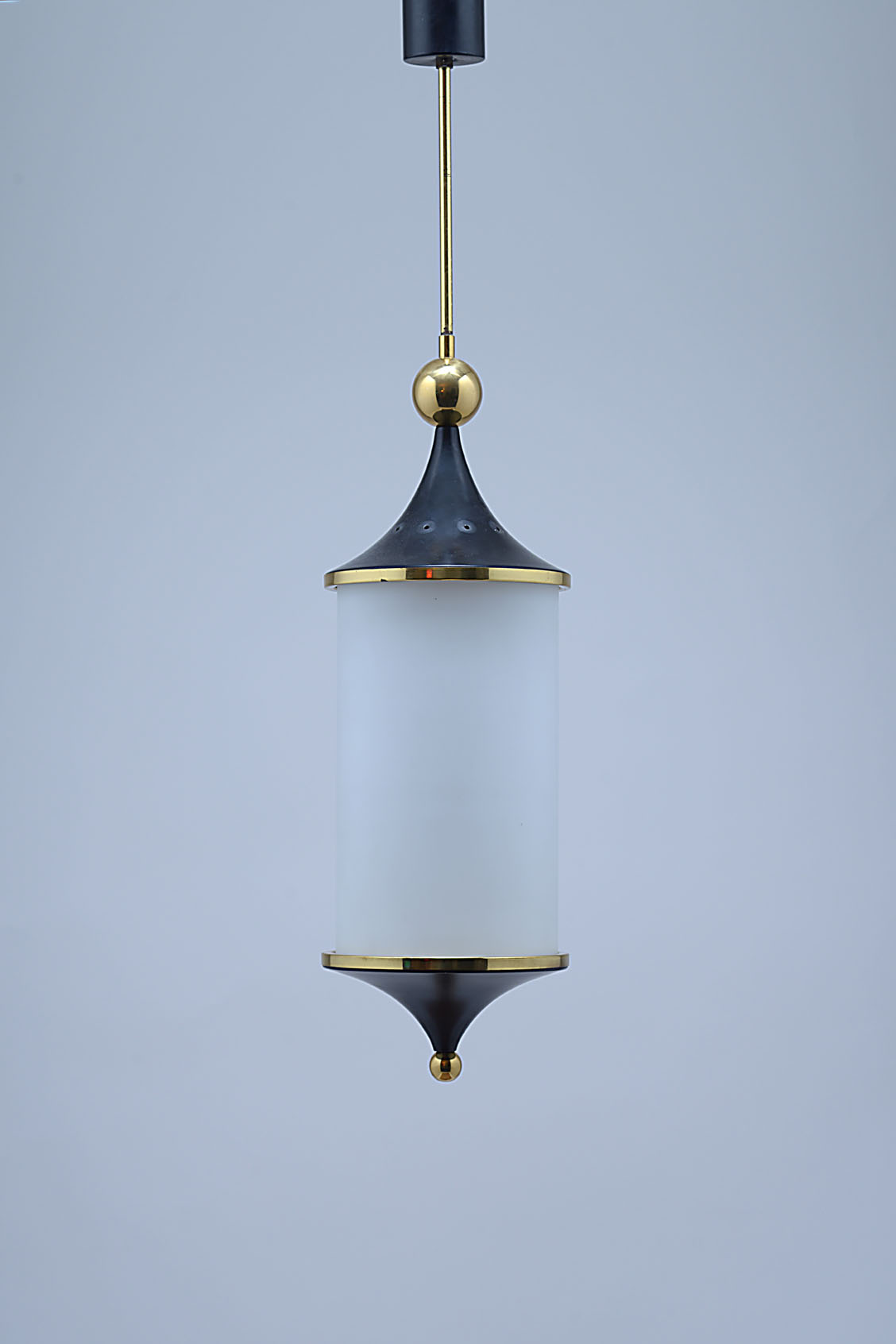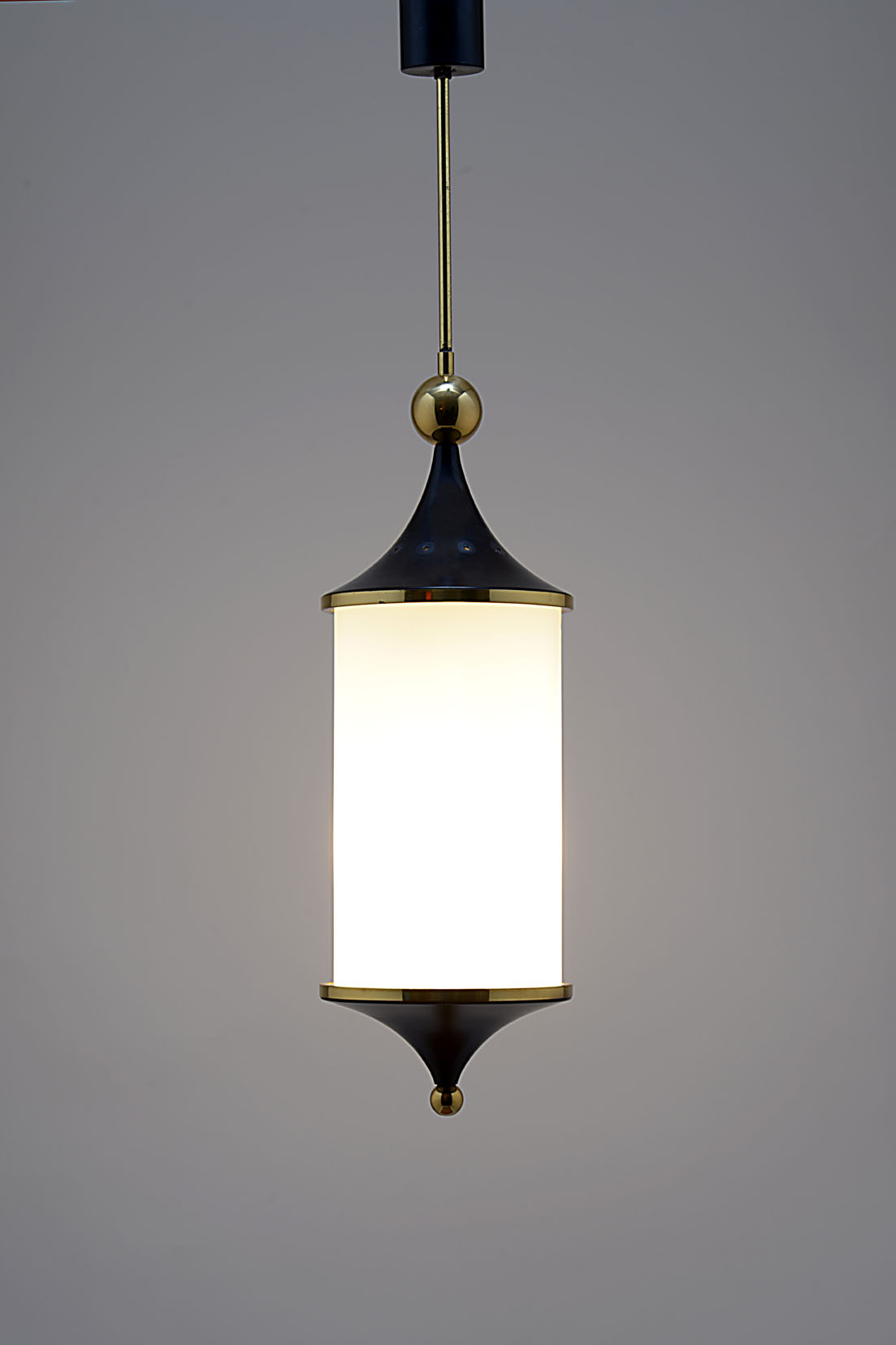 A white satin glass and black painted metal suspension lamp with brass finishings, in the form of a street lamp.