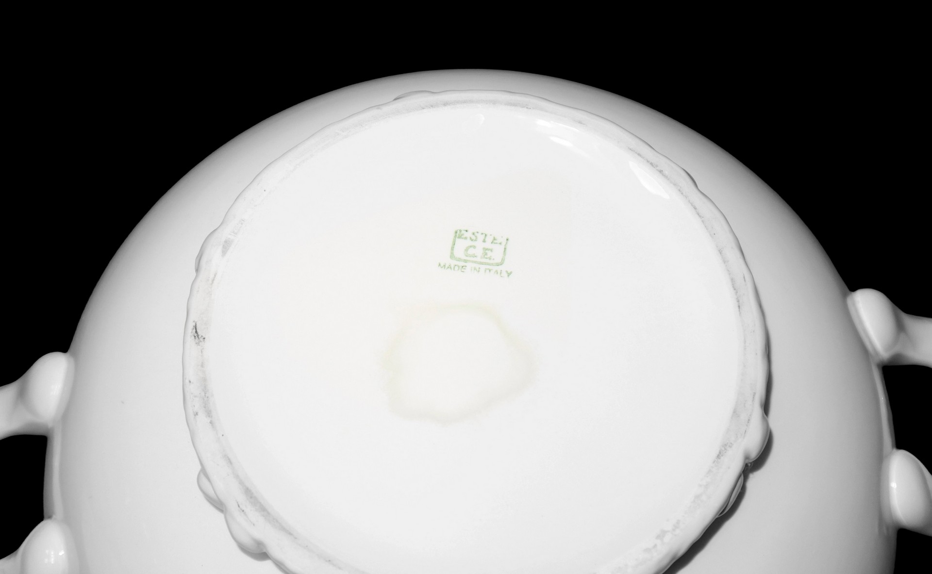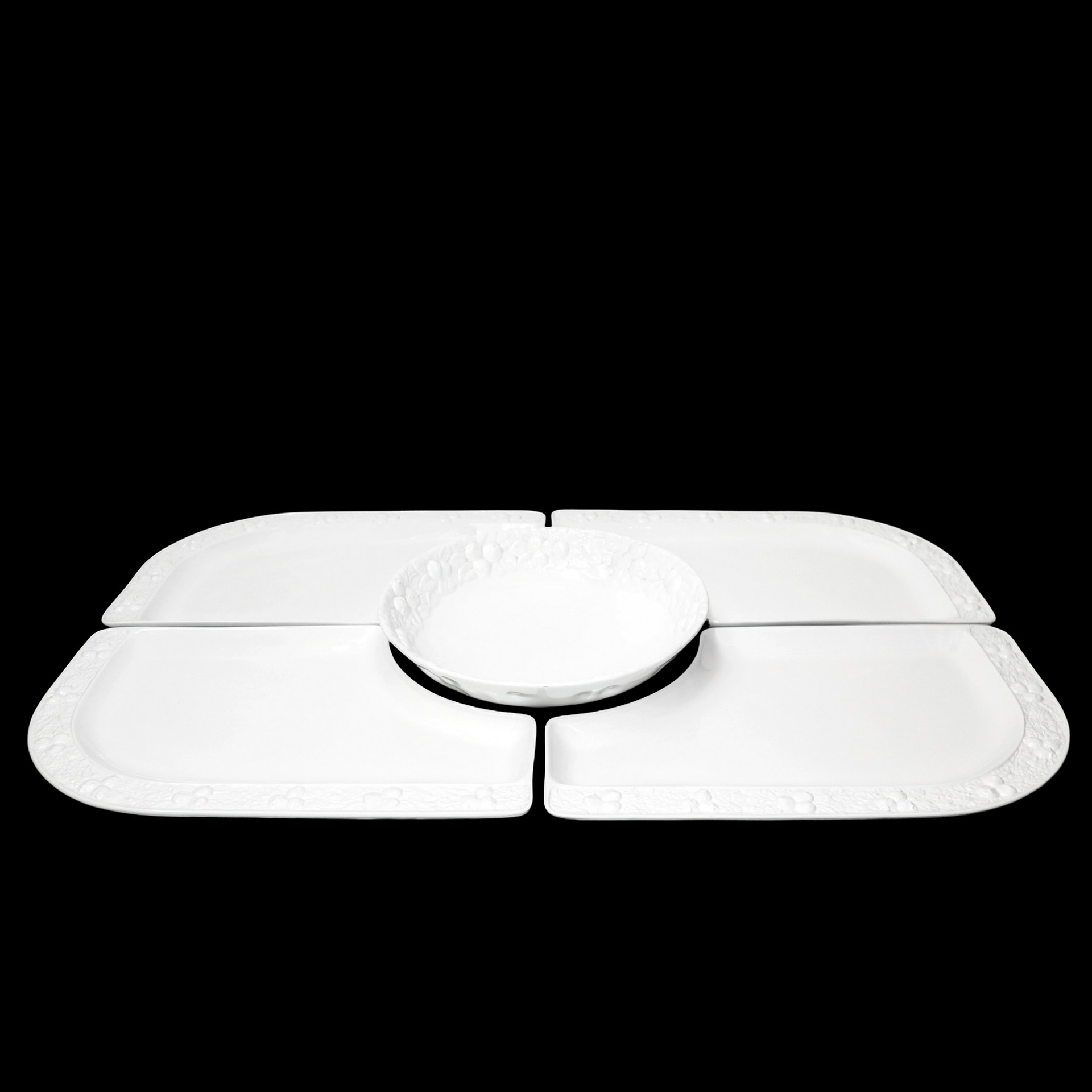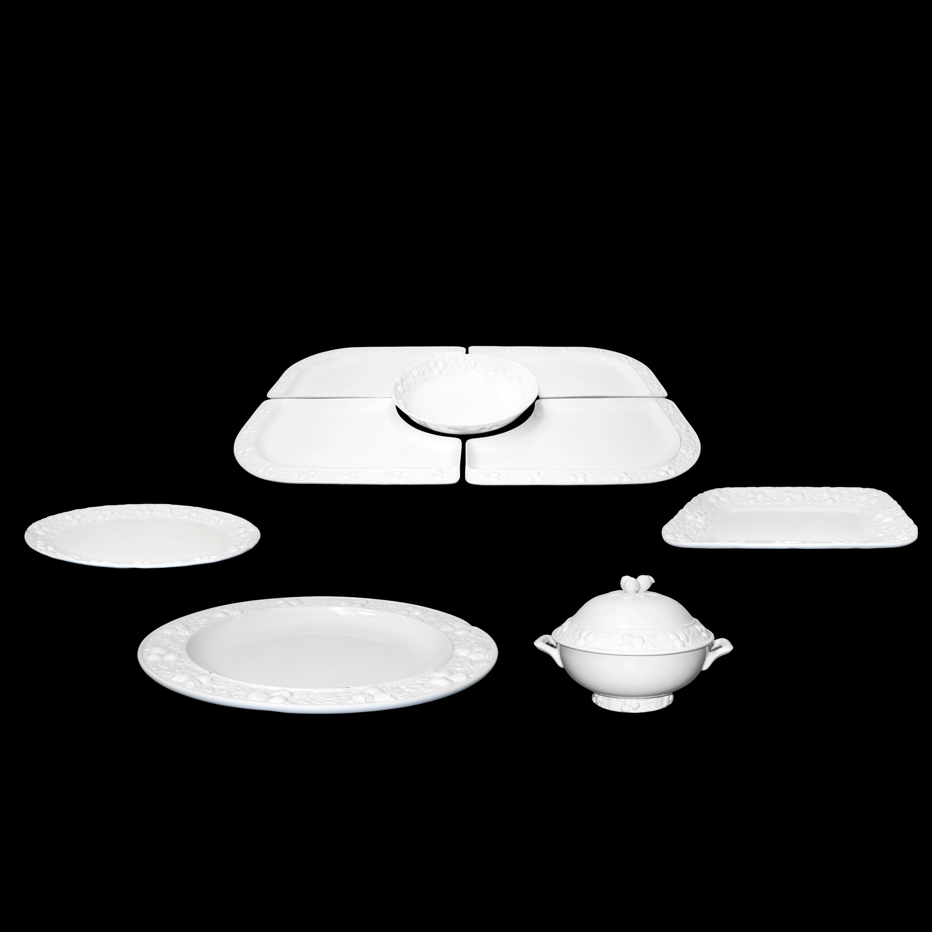 Centrotavola in ceramica smaltata bianca composto da N. 5 ceramiche smaltate, zuppiera e N 3 piatti