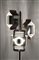A chromed metal floor lamp with three reflectors that are fitted with mirrored topped surface light bulbs.