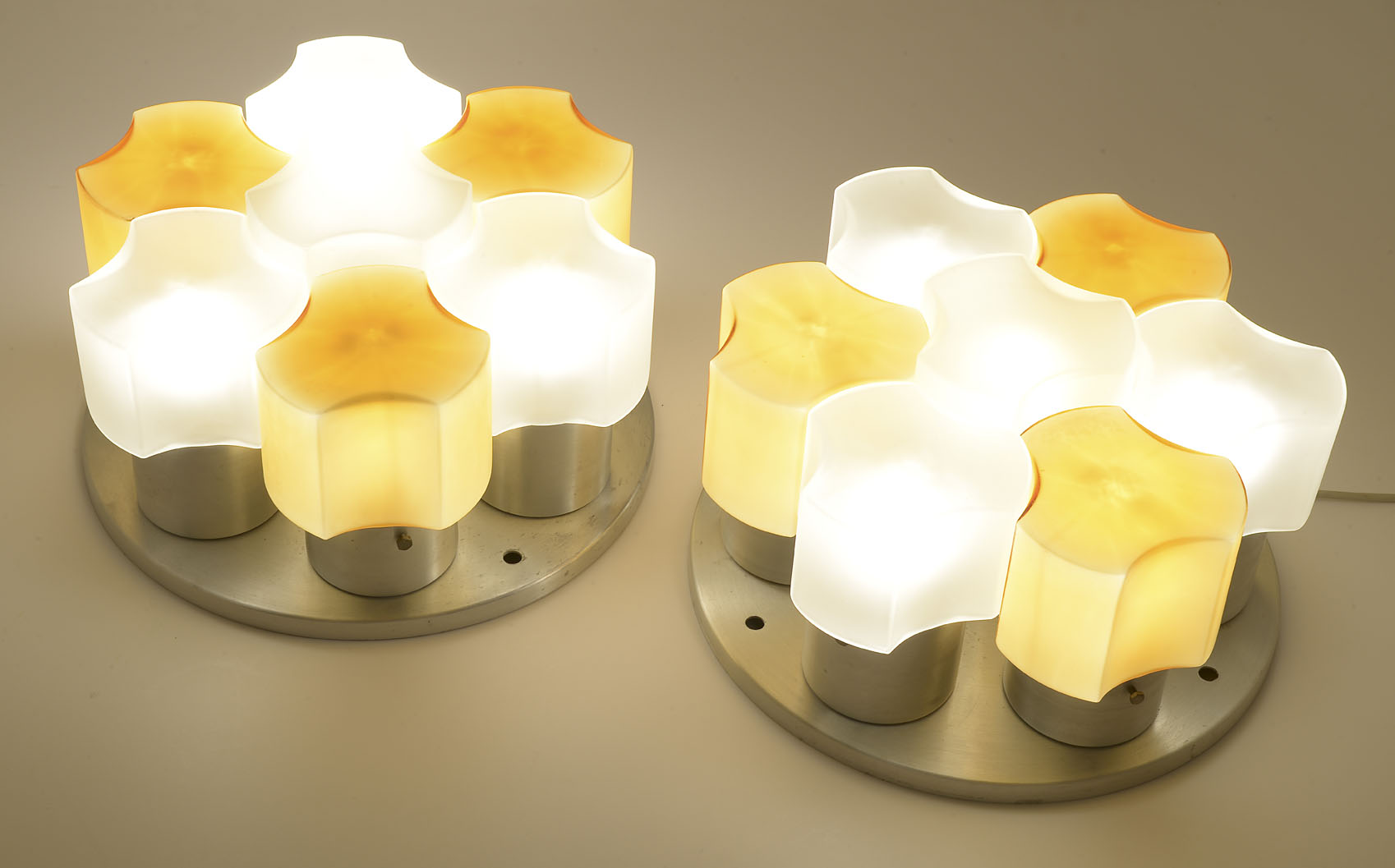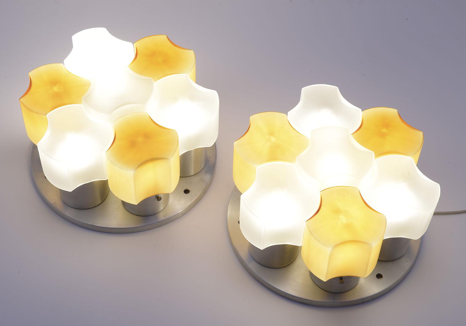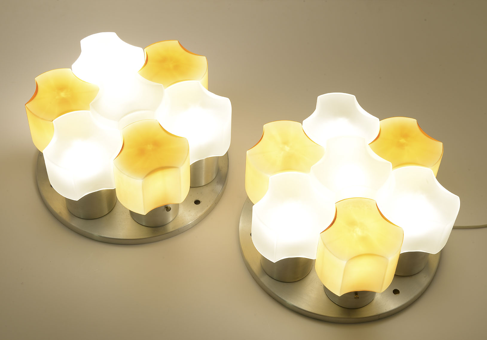 A pair of aluminium wall lights, on circular bases with clear and orange satin glass diffusers that join together to form a flower. Of great decorative effect. Each with seven E 27 light bulb mounts.