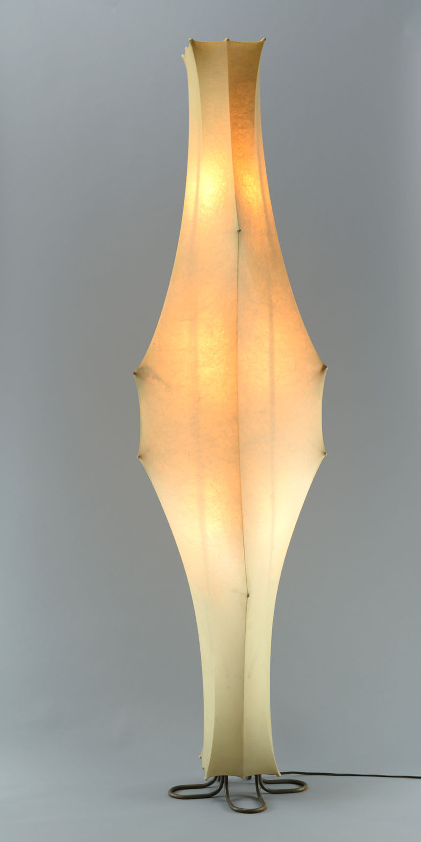 A floor lamp with white varnished steel internal structure with Cocoon resin sprayed over the structure. Three E27 light bulb mounts.