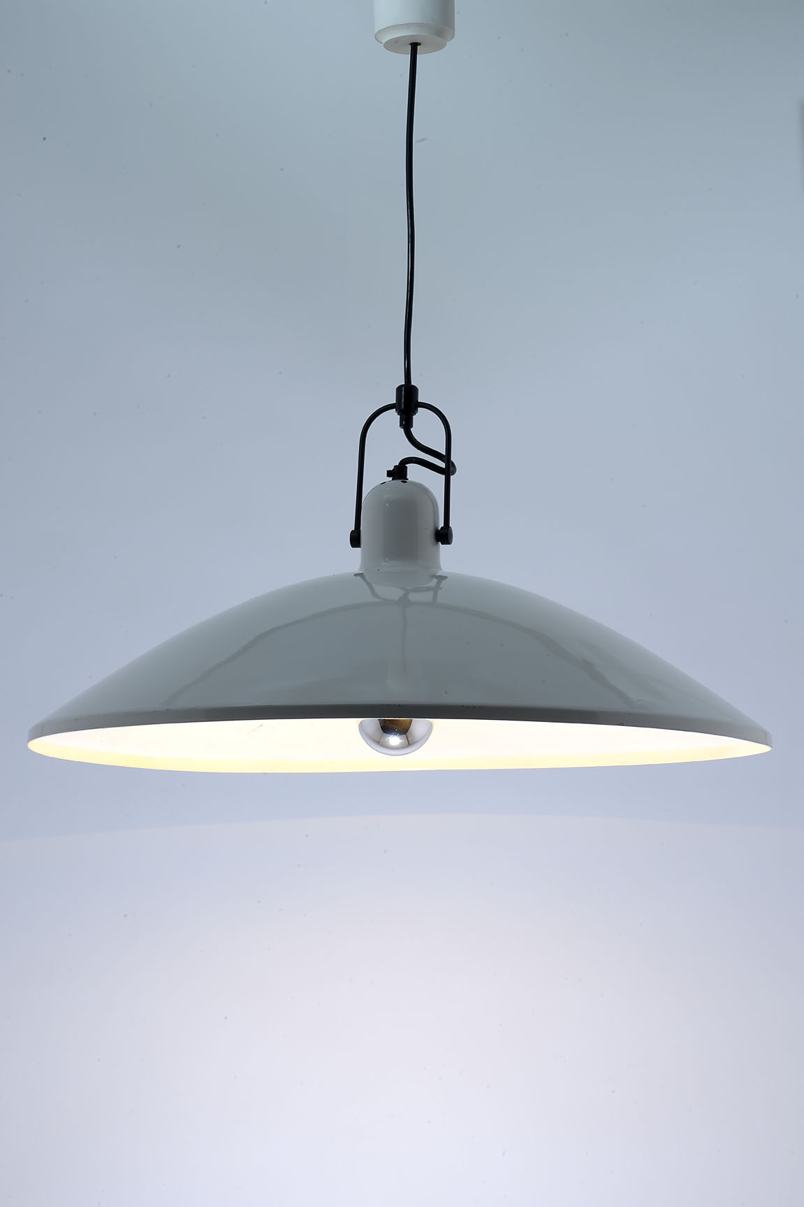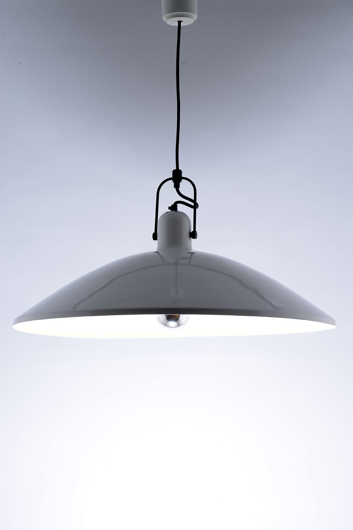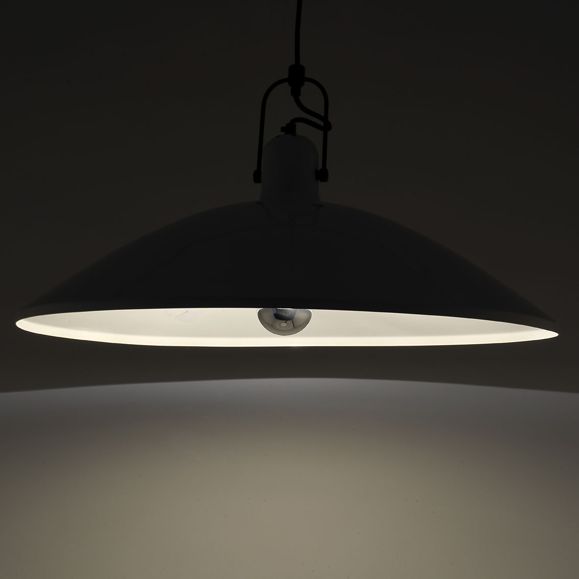 A reflected light suspension lamp, white lacquered aluminium, with ballast. E 27 base with mirrored topped light bulb.