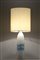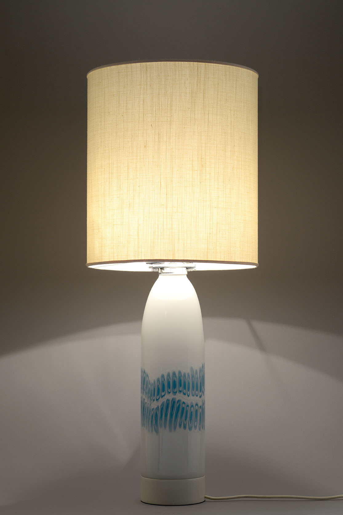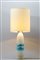 Lamp designed by Peter Pelzel with white glass stem decorated with blue, azure and green murrine motifs. Two E14 and E24 light bulb mounts; lights can be turned on separately or together.