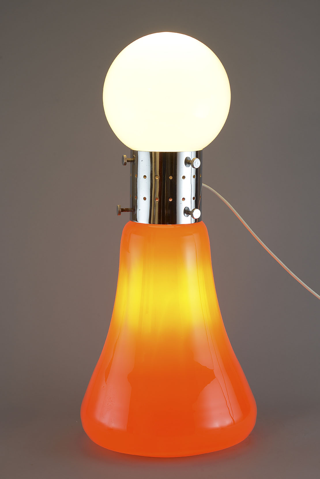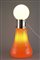 Orange blown glass floor lamp surmounted by a milk white glass sphere. Lit by two lights, one in the sphere and one in the base. The white sphere is not the original.