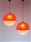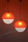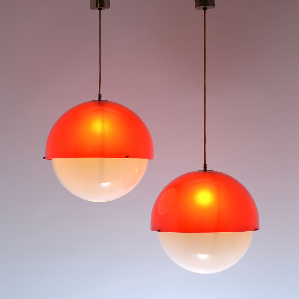 A pair of red methacrylate spherical lamps with opaline white diffusers and chrome-plated brass screws.