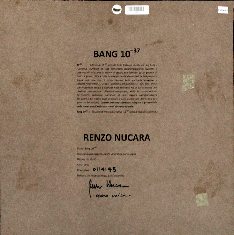 RENZO NUCARA, "Bang 10-37 (elevato alla -37)", 2011, Resine, oggetti, colore serigrafico, carta, legno, Dim. 50x50, Opera archiviata al N° 0114143, Al verso: spiegazione dell'opera, autore, titolo, tecnica, dimensioni, anno, N° archivio, dichiarazione di autenticità dell'artista, opera unica. Opera protetta da teca in plexiglass.