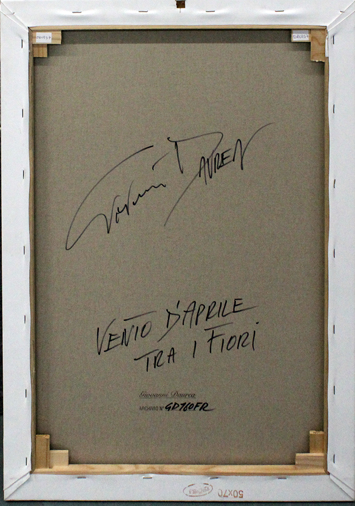GIOVANNI DAUREA, "Vento d'aprile fra i fiori", Olio su tela, Dim. 70x50, Al fronte: firma in basso a destra, Al verso: numero di archivio N°GD156FCR, firma, titolo, tecnica, timbro dell'artista. Opera senza cornice.