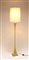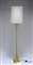 A brass lamp with elongated form that widens at the two ends, plasticized fabric shade. Four E 27 base light bulbs.