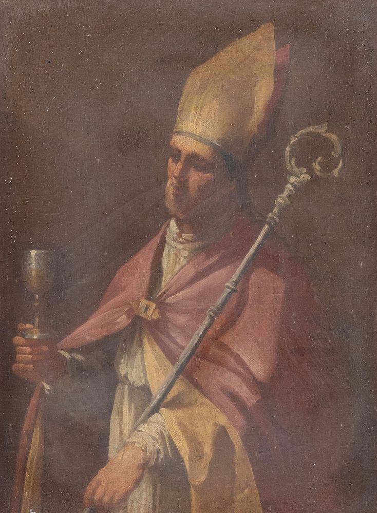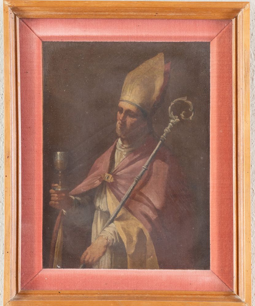 Maestro emiliano del XVIII secolo. "Ritratto di Santo vescovo". Olio su tela. Cm 26x19. A retro reca etichetta della precedente collezione Pantaleoni (reca attribuzione ad Antonio Gionima).