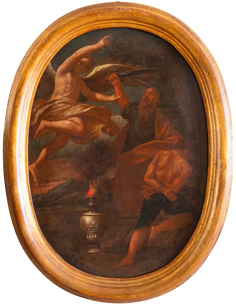 Maestro del XVIII secolo. "Agar e l'Angelo" e "Sacrificio di Isacco". Coppia di olii su tela ovale. Cadauno di cm 50x37.
