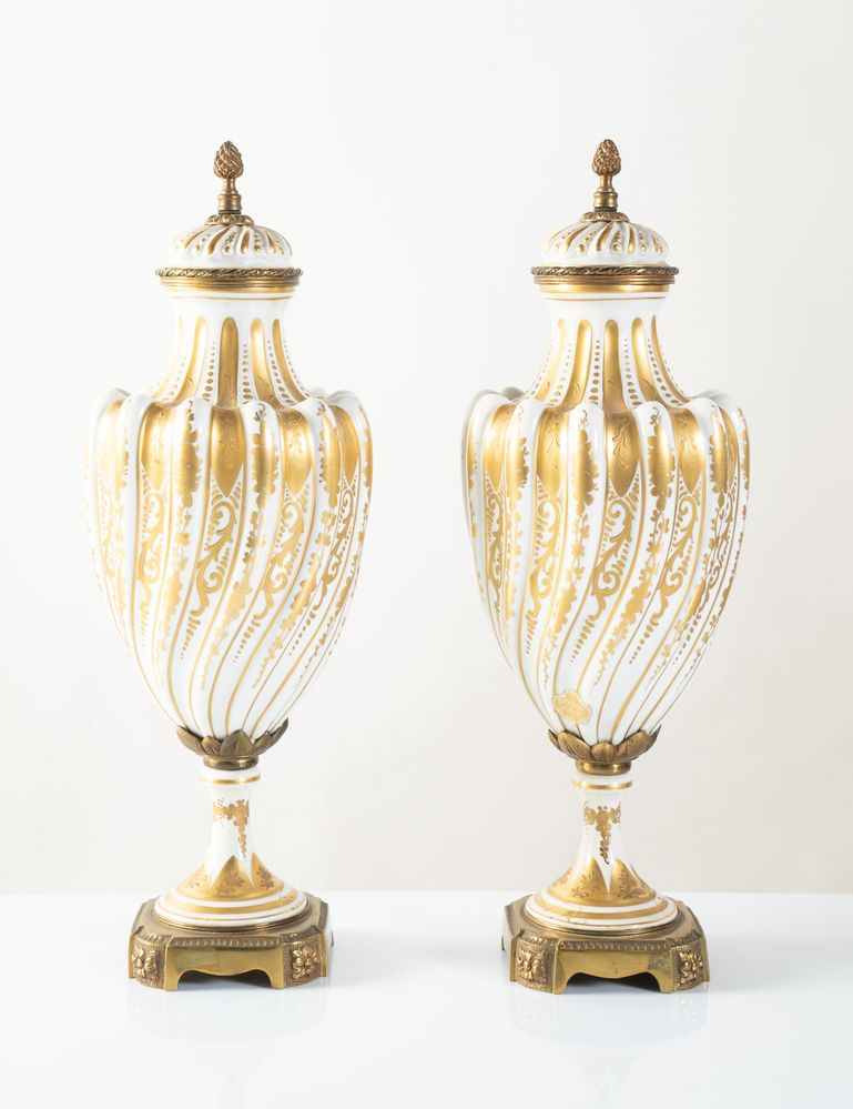 Vecchia manifattura di Sevres, verso la metà del XX secolo. Coppia di vasi in porcellana dipinta dorata con applicazioni in bronzo. Cadauno di cm 50x⌀ 17. Sotto la base recano marchio.