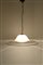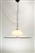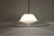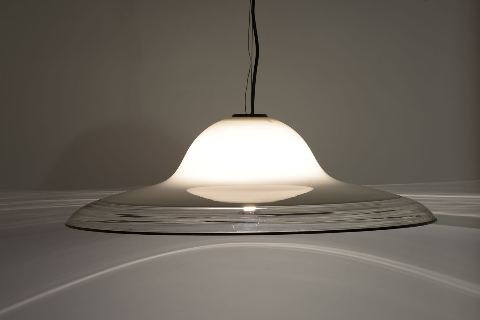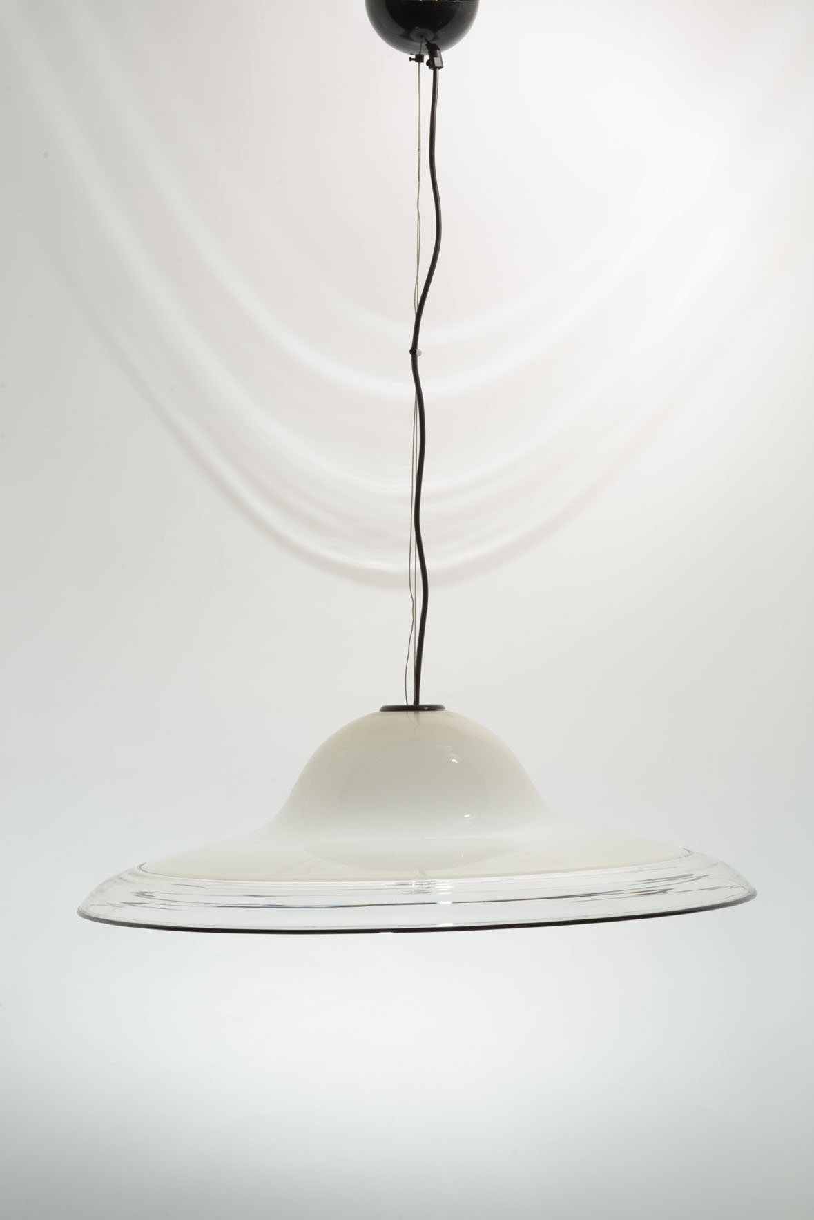 A large 'witch-hat' milk white overlaid glass chandelier with transparent edge, suspended by a steel cable. Transfer printed on edge "Effetre International".