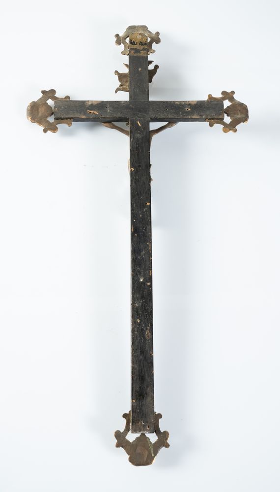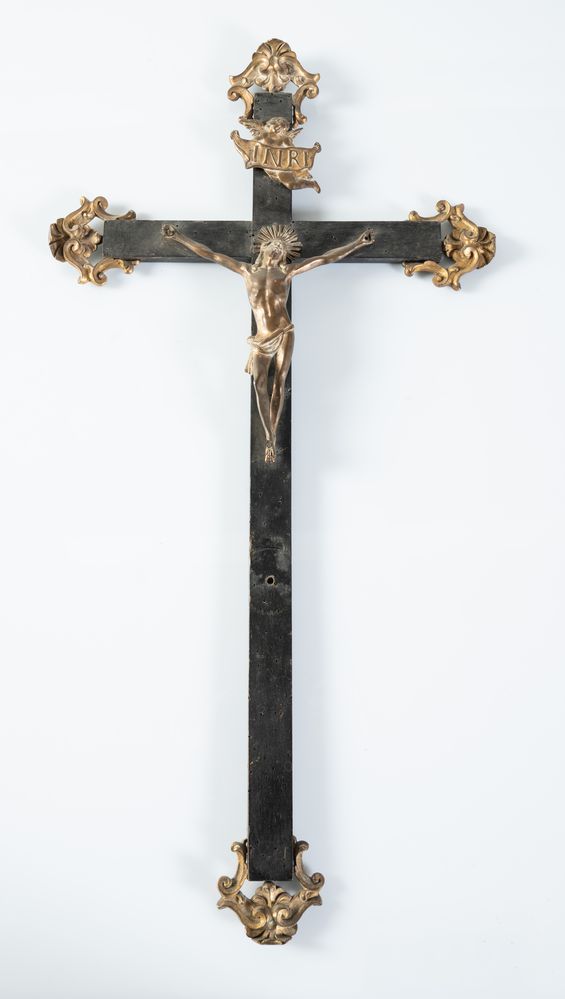 Crocifisso in legno ebanizzato con puntali in bronzo dorato e figura del Cristo in bronzo lucidato. Emilia, prima metà del XVIII secolo. Cm 64,5x32,5x3,5. (difetti)