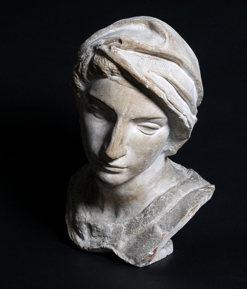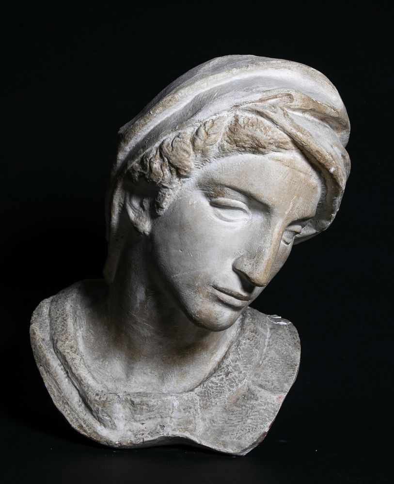 Manifattura italiana del XIX secolo - XX secolo. Calco in gesso raffigurante testa della Madonna Medici di Michelangelo, dalle Cappelle Medicee. Cm 43x38,5x22.